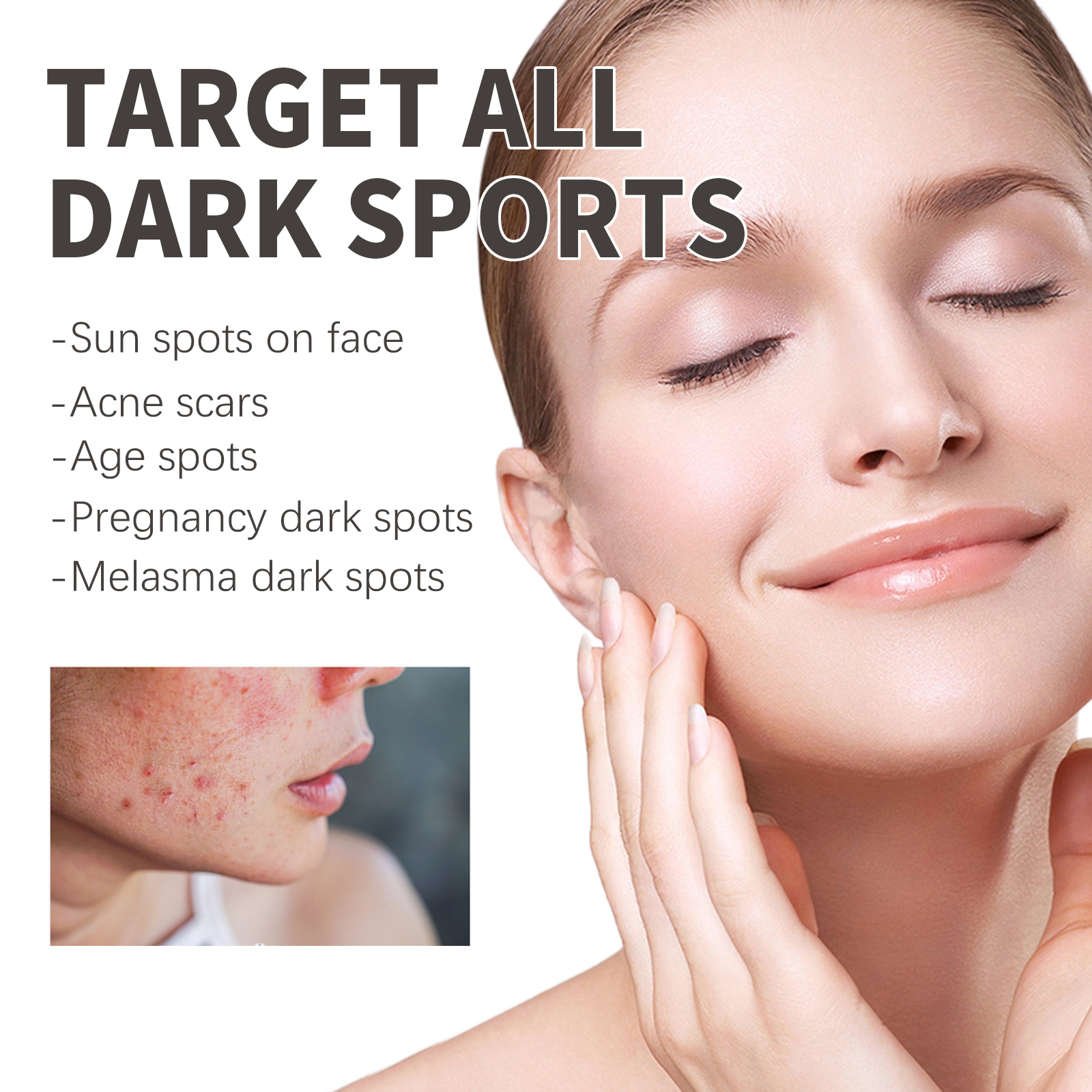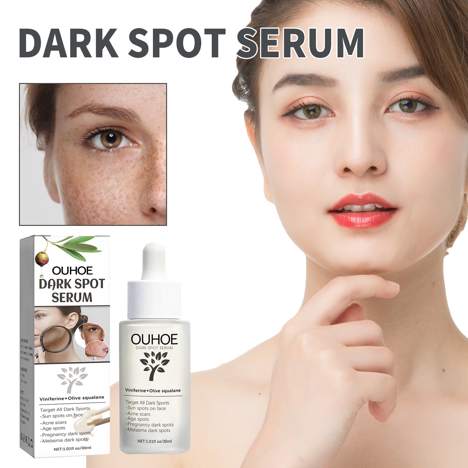Our Dark Spot Serum contains vincristine, olive and squalane. It can eliminate antibacterial and anti-inflammatory skin acne and make the skin smooth and even; Promote skin blood circulation, restore skin firmness and elasticity; Moisturize skin, balance water and oil, soften cutin, fade spots. Its use is very simple: after cleansing, apply the product on the palm, emulsify it on the face, gently massage until absorbed. It eliminates acne and pimples, leaves no dark spots, and removes dirt and oil that clogs pores.