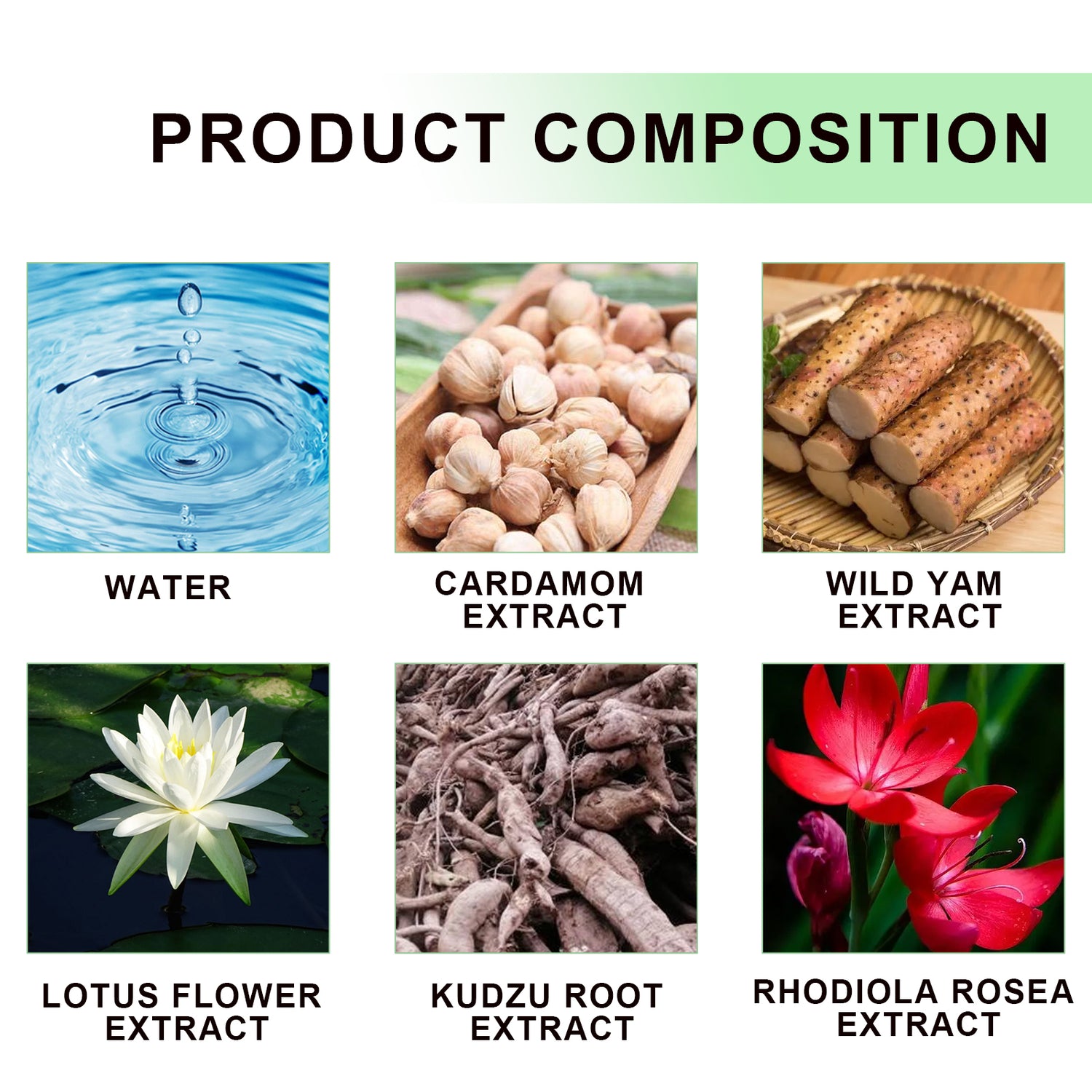 Our natural herbal breast spray contains cardamom extract, wild yam extract and lotus flower extract. It can moisturize breast skin, rich in vegetable ingredients, help lift saggy skin, improve skin sagging, and make your breasts full and full of dimensions. The way to use it is simple: wash the chest and keep it dry; Apply appropriate amount to the chest and massage gently in circular motions with fingertips until fully absorbed. Achieve optimal breast health and shape, make your breasts look fuller, help lift sagging skin, improve sagging skin issues, shape the appearance of your breasts, make them fuller and firmer.