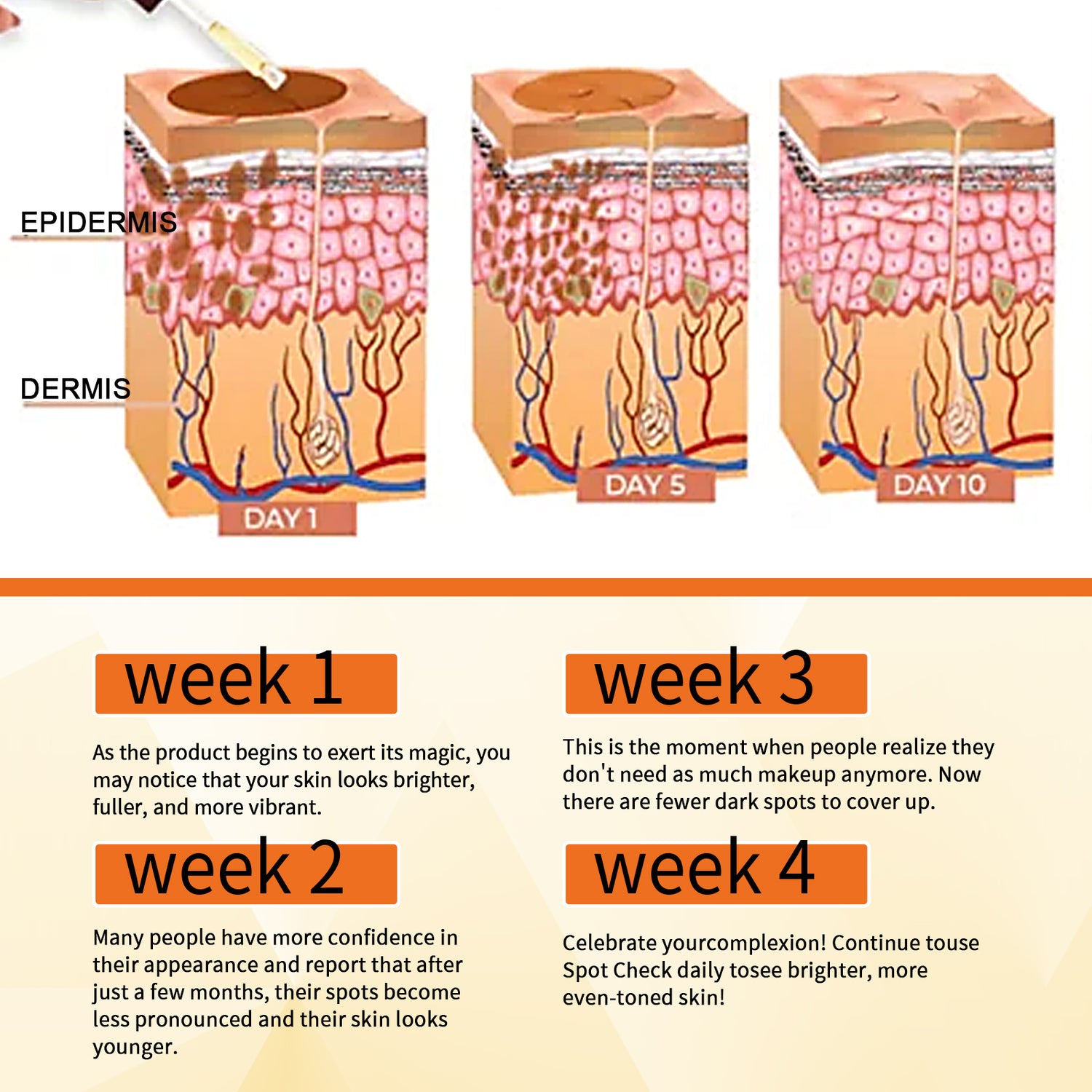 Our skin melanin repair serum contains vitamin C, retinol, aloe vera extract. It can effectively treat pigmentation and eliminate dark spots caused by too much UV exposure. This protective effect helps to reduce the occurrence of freckles, dark spots and sunburn. Its application is simple: First, thoroughly clean the face, pat dry, and apply a small amount of serum to the face, focusing on areas with dark spots or pigmentation. Gently massage the serum into the skin using an upward circular motion. Allowing the serum to be fully absorbed into the skin before applying other products will help promote a more even skin tone, improve the overall skin quality, reduce pigmentation on the skin, and help brighten and rejuvenate the skin.