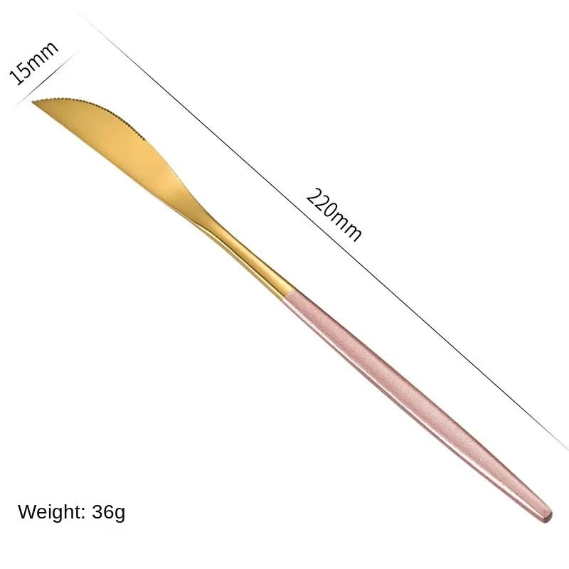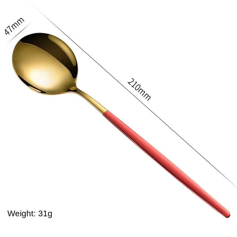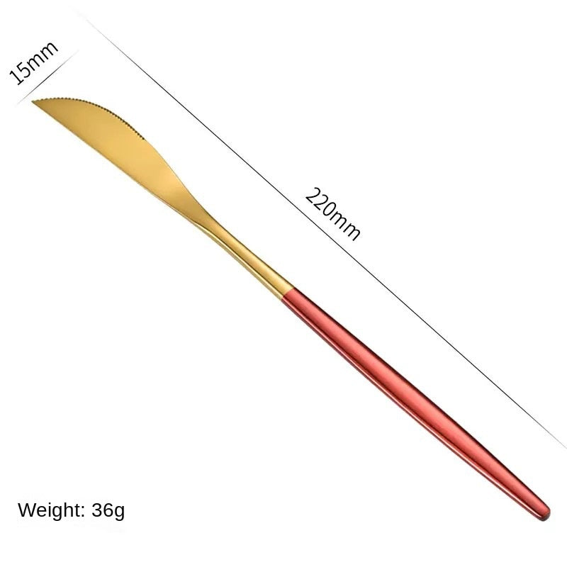 Stainless Steel Cutlery Set with Portuguese Gold Spray Painted Steak Knife, Fork, Spoon, and Tea Spoon 4-Piece Gift Pack - Red Gold 4-Piece Set is backordered and will ship as soon as it is back in stock.
