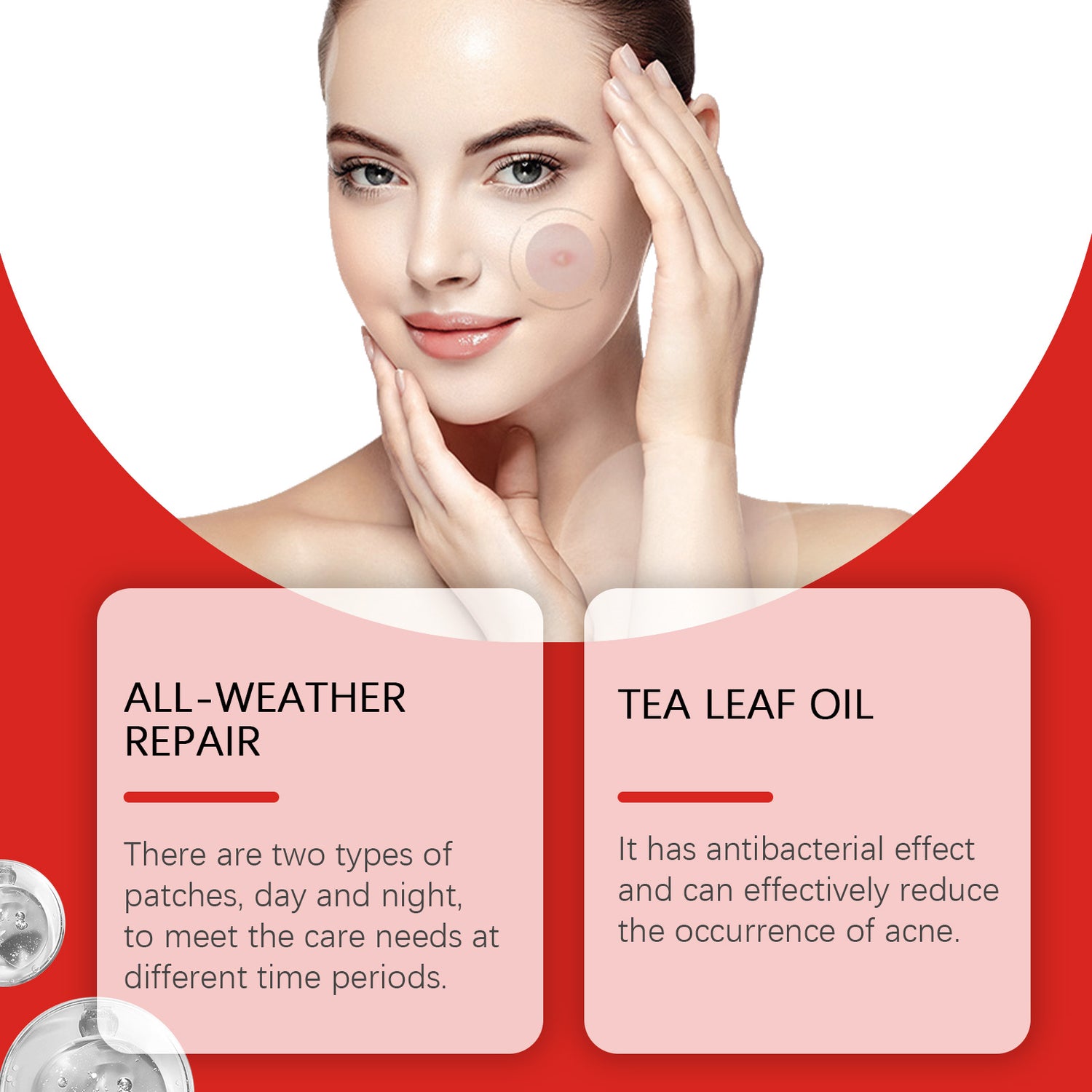 Our acne patches contain PEVA. It can treat acne and other skin blemishes quickly and effectively, reduce inflammation and redness, and help preserve clean and flawless skin. How to apply it is simple: 1. Gently clean the skin around acne. 2. Remove the patch and apply it directly to the area. 3. Gently press the patch for about 5 seconds to ensure a good fit. Remove the patch and gently clean the skin. There are two types of patches, day and night, to meet the care needs of different time periods. It has antibacterial effect and can effectively reduce the occurrence of acne.