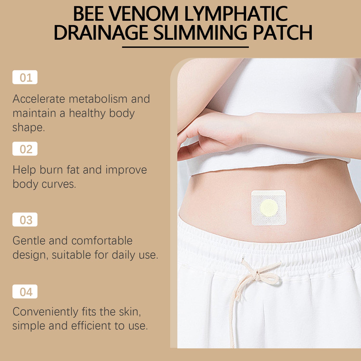 Our body care patches contain cinnamon extract and pepper extract. It can promote the burning of body fat, help to improve the shape of the curve, boost self-confidence. Its application is simple: clean the skin on the abdomen and keep it dry, apply the product to the correct position on the abdomen, press gently to ensure that it is attached to the abdomen, let it sit for 4 hours and peel off the patch. It also reduces the absorption of fats, sugars and starches, supporting a more balanced body shape.