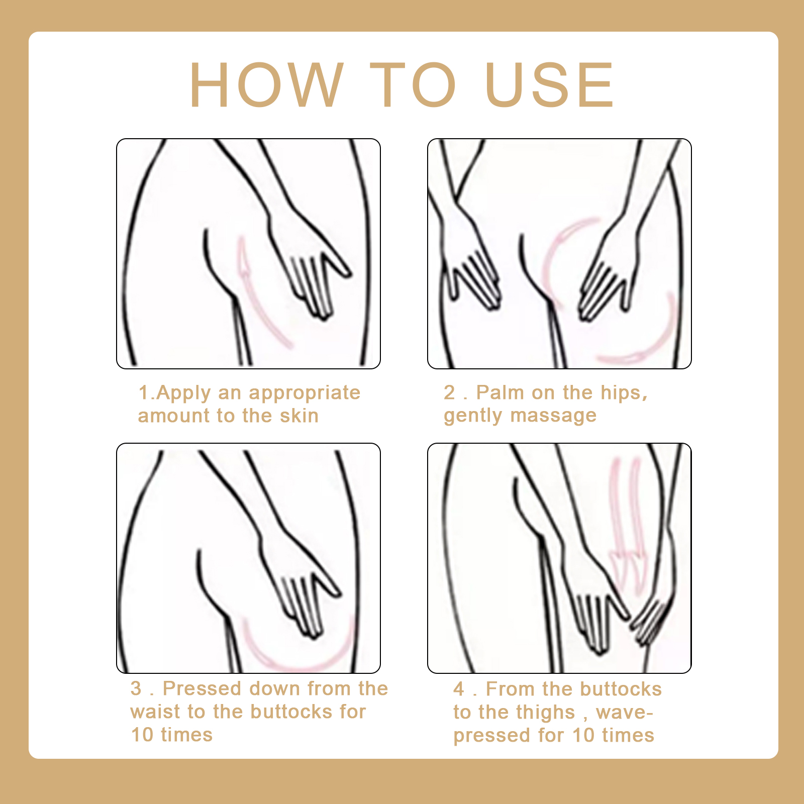 Our hip oil contains tocopherol (vitamin E) and safflower flower extract. It can deeply moisturize and nourish the skin, enhance the elasticity of the skin, make the skin smooth and tender, and make your buttocks full of vitality, full, round and youthful. Its use method is very simple: 1. Apply appropriate amount on the skin; 2. Place palms on hips and gently massage; 3. Press down from waist to hips 10 times; 4. Wave 10 compressions from hips to thighs. Improve rough skin, improve the firmness and elasticity of dehydrated skin, lift the buttocks and buttocks.