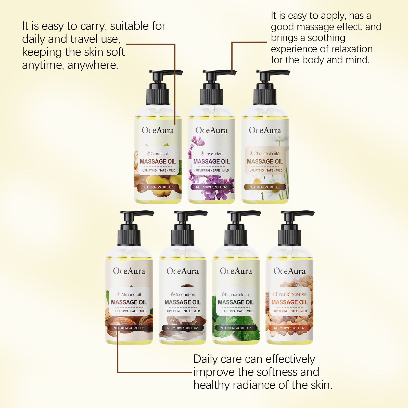 Our Coconut Oil body Essential oil contains coconut oil, tea tree oil, glycerin. It can help improve skin moisture, lock in moisture for a long time, and keep skin soft and smooth. Its application method is simple: 1. Clean the skin and keep it dry; 2. Apply appropriate amount to the whole body. 3. Gently massage until absorbed. Nourish and improve skin. Effectively protect skin and keep skin clean. Helps to lighten the skin and enhance skin vitality.