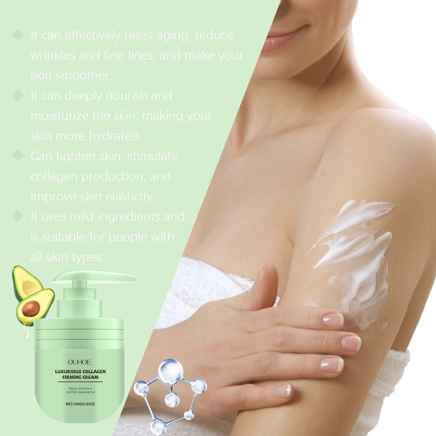 Our collagen moisturizer contains collagen, shea butter, acetyl tripeptide-1. It can significantly improve wrinkles and fine lines. Deep moisturizing, providing deep and lasting moisturizing effect. Its application method is simple: 1. Thoroughly clean and dry the skin; 2. Apply proper amount of this product to buttocks evenly. Legs, chest, arms and other parts of the body. 3. Massage gently to promote better absorption. Enhance skin elasticity and rejuvenate. Regular use reduces the appearance of wrinkles and fine lines.