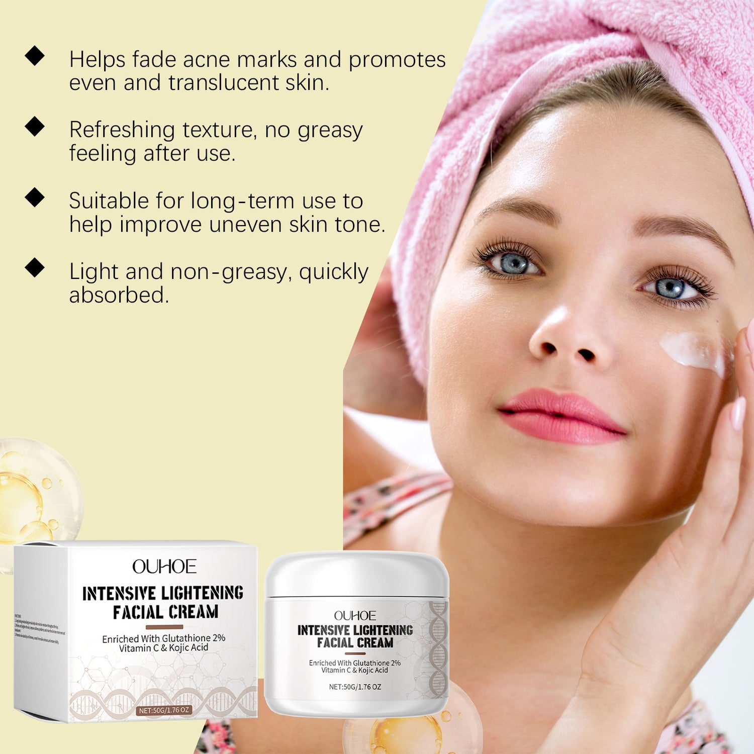 Our facial moisturizer contains Jojoba seed oil, glutathione, and vitamin C acid. It contains a variety of active ingredients to help improve dull skin tones and brighten skin. Provides long-lasting moisture to keep skin soft and moisturized. The way to use it is simple: clean the face and body skin and keep it dry. Take appropriate amount of cream and apply evenly to the skin. Use gentle circular massage to promote absorption. And can niacinamide and kojic acid synergistic effect, help to lighten the stain, enhance the skin luster.