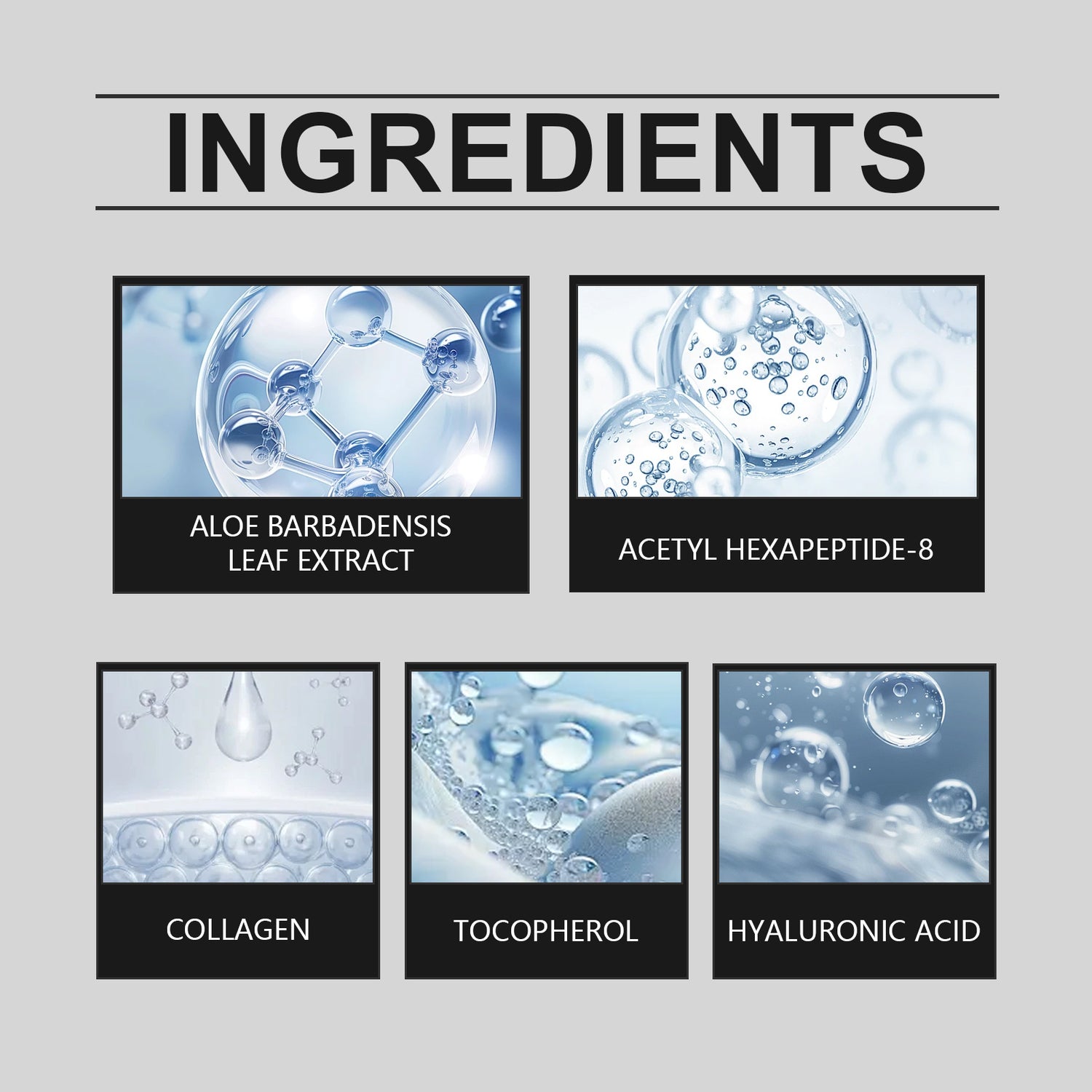 Our anti-wrinkle firming cream contains aloe vera leaf extract, acetyl hexapeptide-8. It can be gently applied to give skin a firm feeling and improve facial contour. The way to use it is simple: clean your facial skin. Apply a small amount of this product evenly to the face. Massage gently to promote absorption. Helps to reduce the lines of squid feet and face, showing a smooth skin texture.