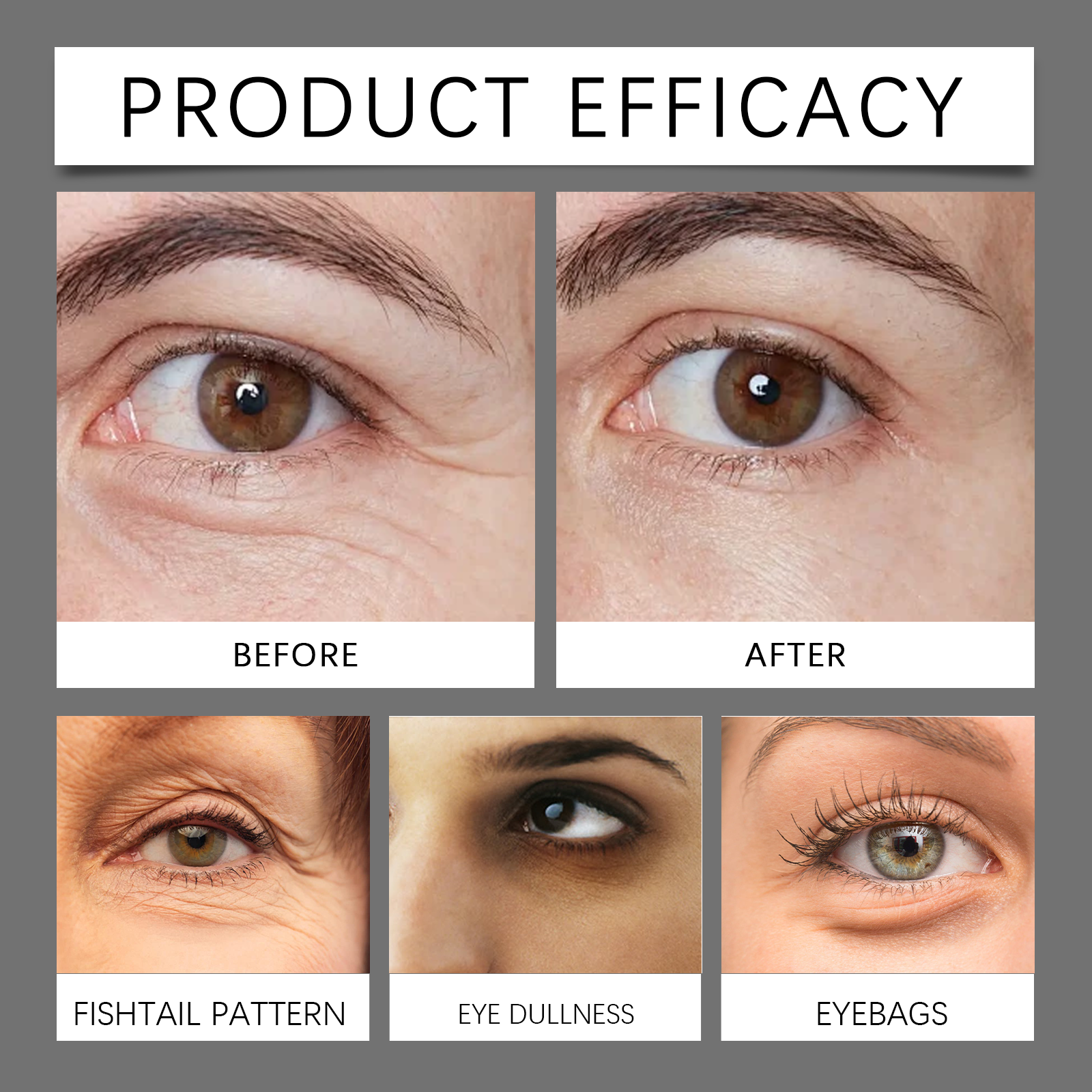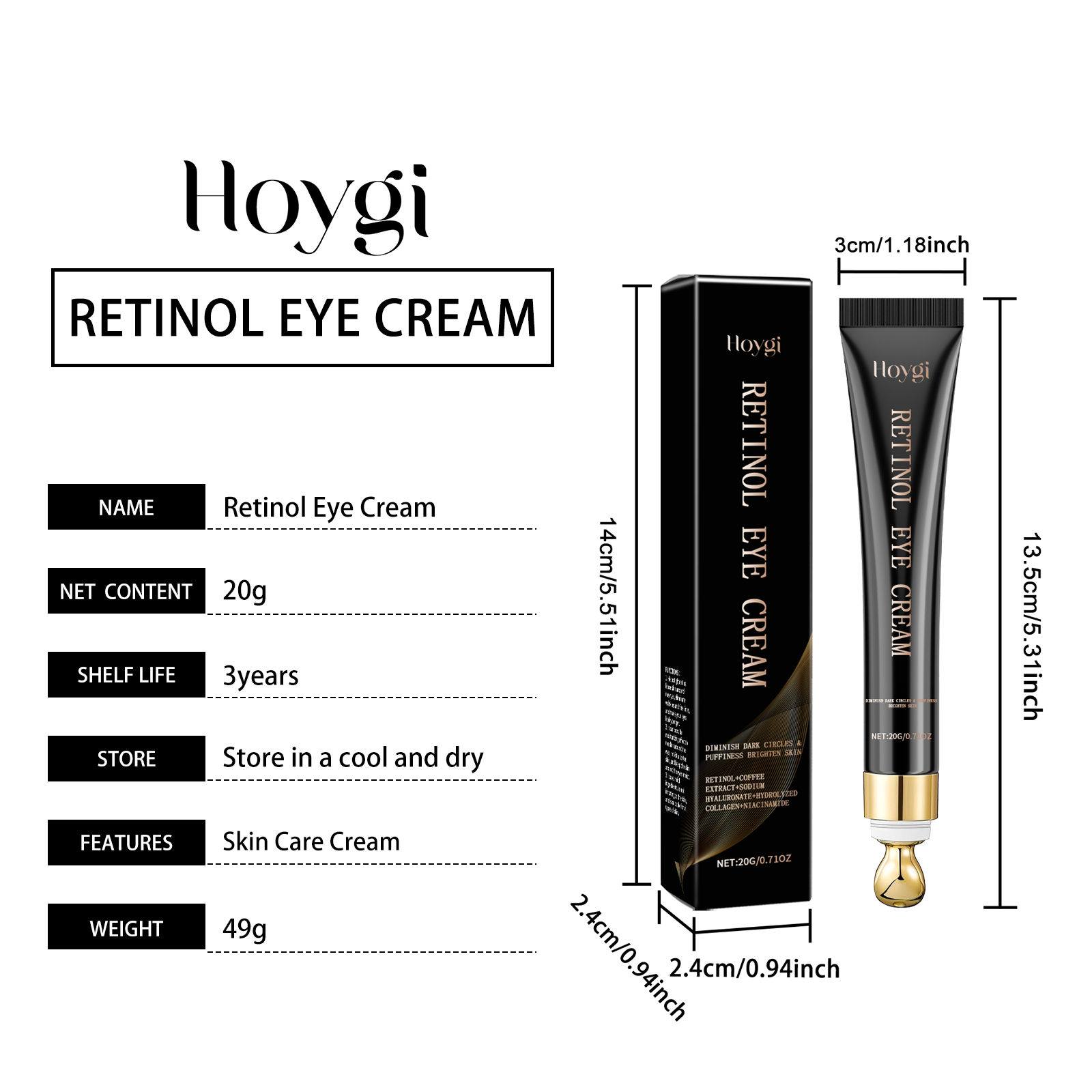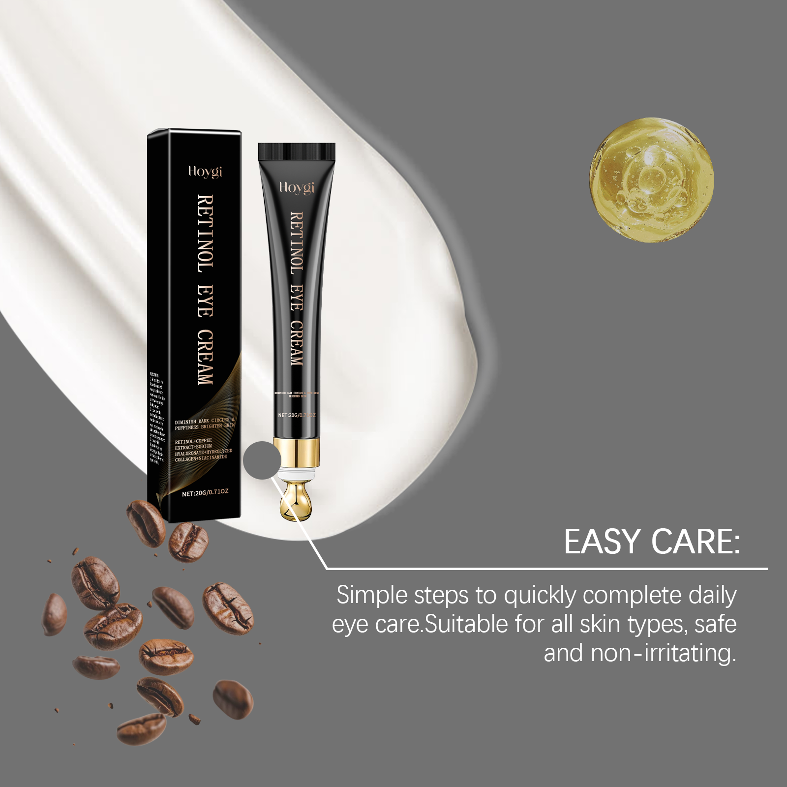 Our firming eye cream contains retinol, coffee extract, sodium hyaluronate. It can improve the darkness around the eyes and restore bright eyes. Improves eye skin firmness and reduces fine lines. Its application method is very simple: take an appropriate amount of this product evenly apply to the skin around the eyes, gently massage until completely absorbed. Clean the skin around your face and eyes and keep it dry. And can be deeply nourishing, provide comprehensive moisture for the eye skin.