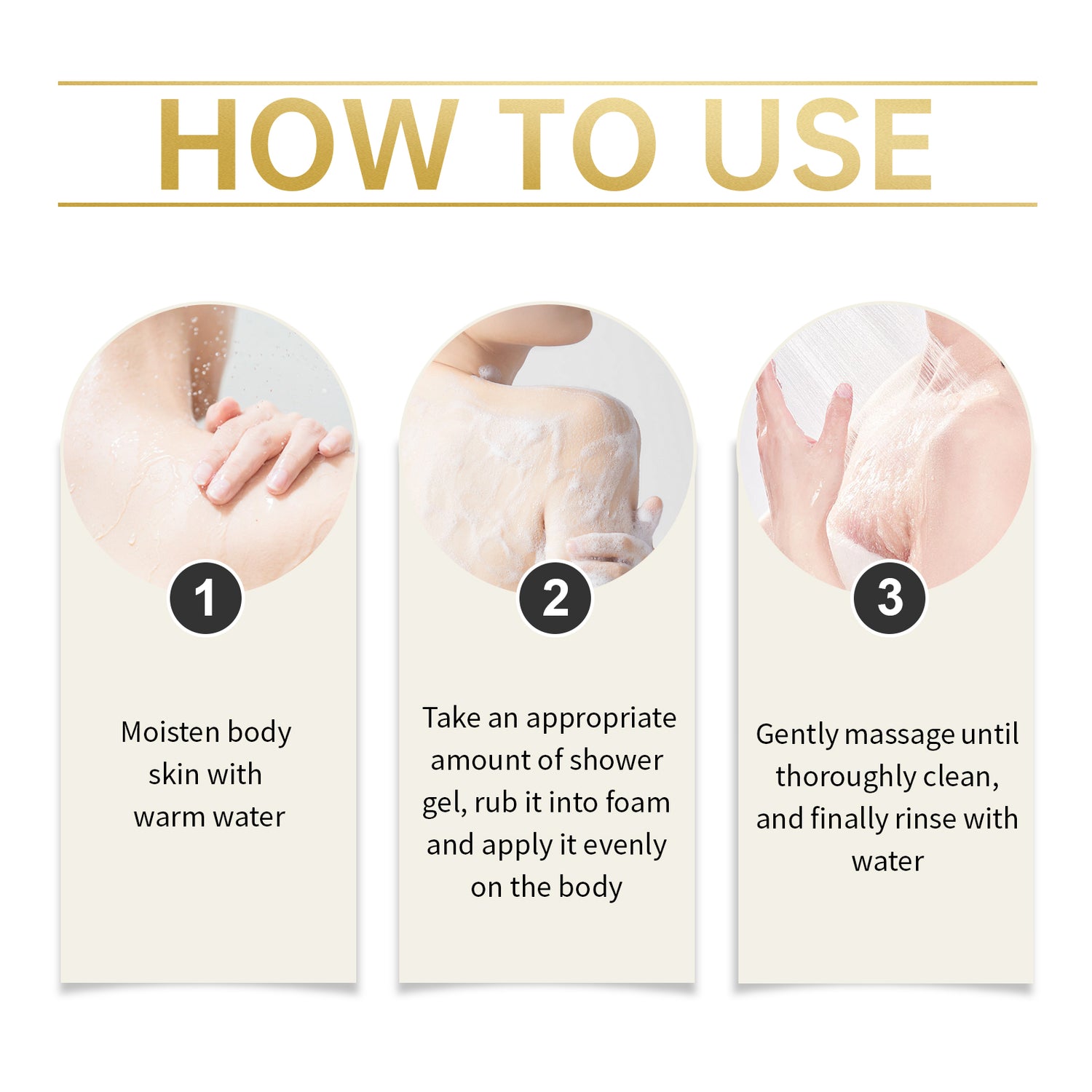 Our golden Collagen body wash contains glycerin, collagen. It gently cleanses the face without damaging the skin's protective layer. Low irritant, suitable for daily use. Its use method is very simple: wet the body skin with warm water, take an appropriate amount of body wash, knead into a foam, evenly apply on the body, gently massage until completely clean, and finally rinse with water. And can be suitable for the whole family to meet the needs of different skin types.