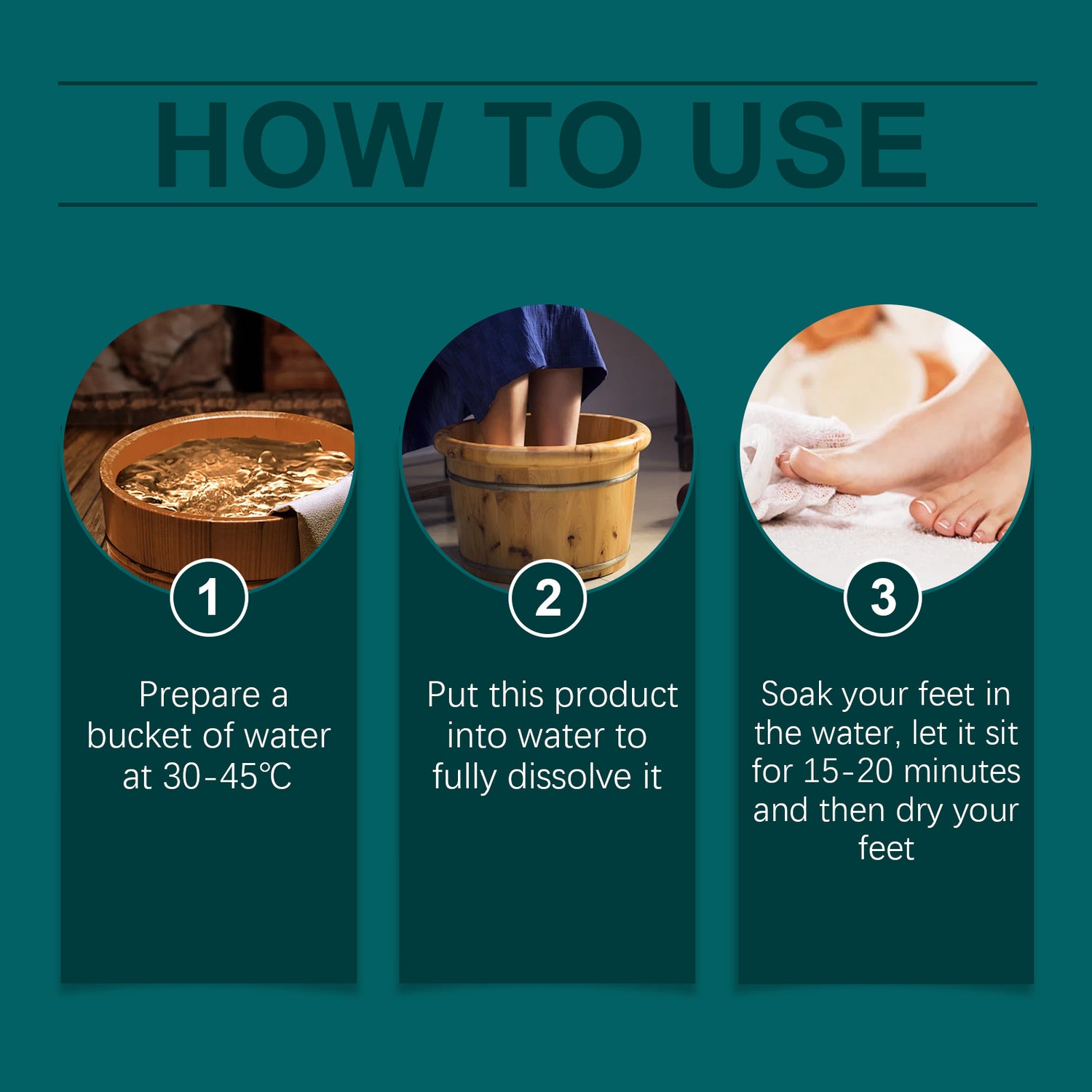 Our herbal foot bath balls contain saffron extract, cinnamon extract and turmeric extract. It can promote the excretion of toxins in the body and improve the physical condition. Relieve tired feet and provide a relaxing experience. Its use method is very simple: 1. Prepare a bucket of water, the temperature is 30-45℃; 2. Dissolve the product fully in water; 3. Soak your feet in water, let them sit for 15-20 minutes, and then dry them. Contains a variety of herbal extracts to gently care for your feet.