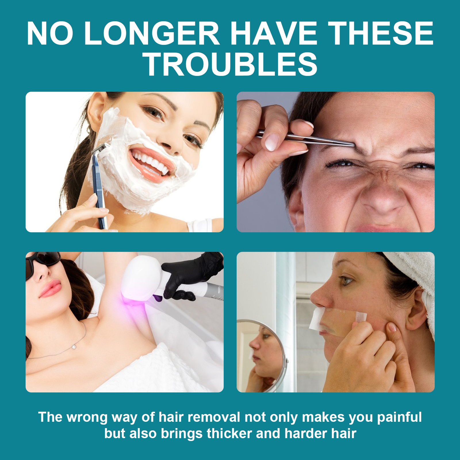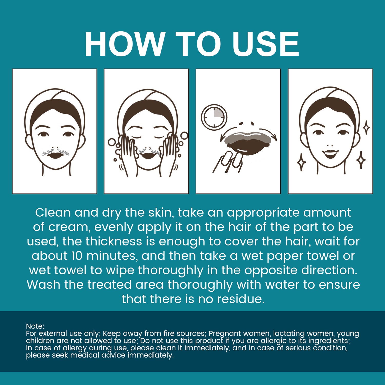 Our hair removal cream contains Asiaticum extract, potassium hydroxide. It can quickly remove lip hair from your lips. Its use method is very simple: clean and dry the skin, take an appropriate amount of lotion, evenly apply on the part of the hair that needs to be used, the thickness should be enough to cover the hair, wait for about 10 minutes, and then wipe thoroughly with a wet paper towel or wet hair in the opposite direction, thoroughly wash the treated area with water to ensure that there is no residue. And the ingredients are mild, safe to use.