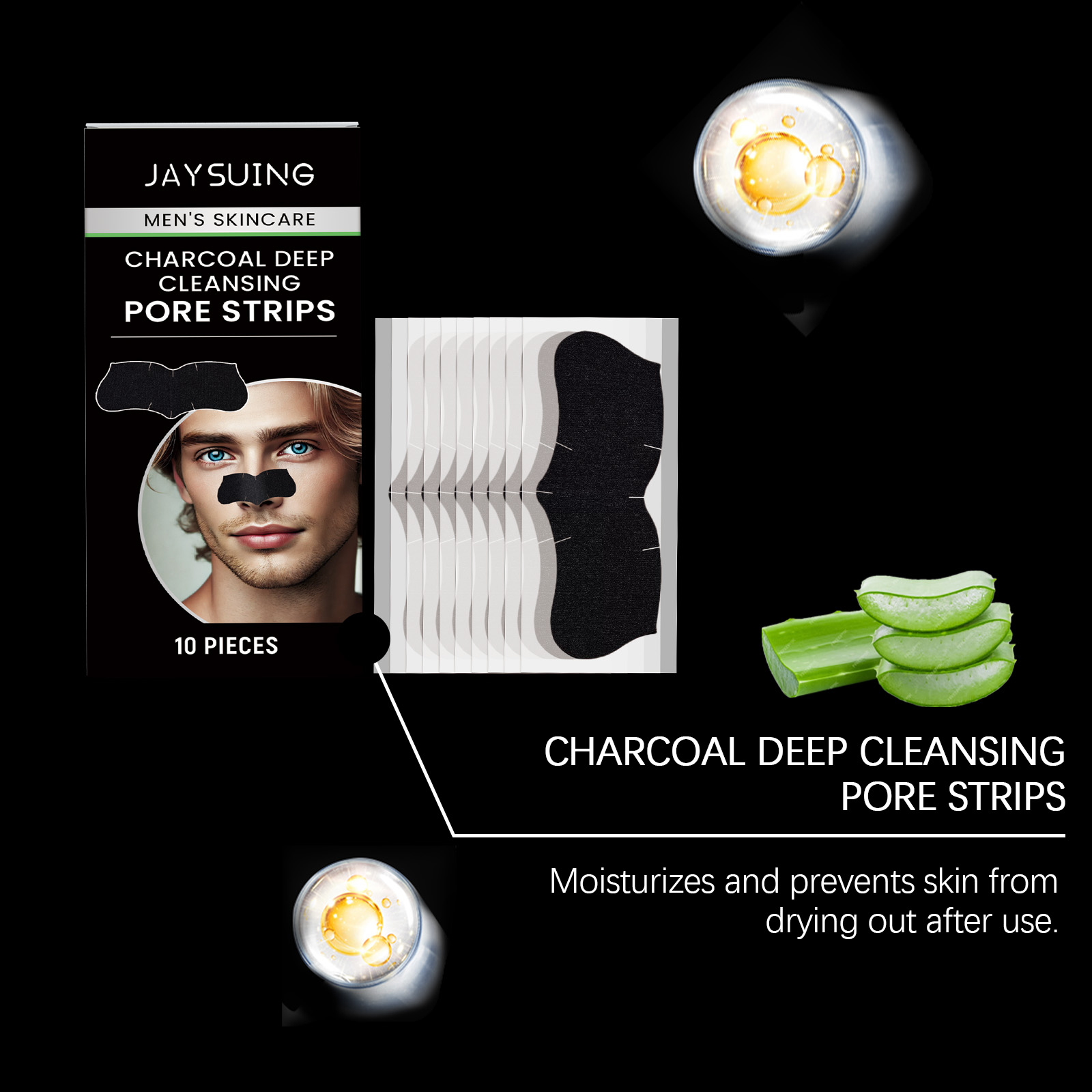 Our Men's Blackhead pore patch contains witch hazel extract and field lotus extract. It penetrates deep into pores, thoroughly removes blackheads and dirt, and improves the texture of nose skin. Its application method is very simple: 1. Clean the nose and surrounding skin. 2. Remove the patch, place it on your nose, and gently press it so that it fits tightly into your skin. 3. Let it sit for 10-15 minutes, then remove the nose strip. Absorb blackheads, clean deep pores and improve skin quality. The highly elastic material fits the nose and is uncomfortable to use.