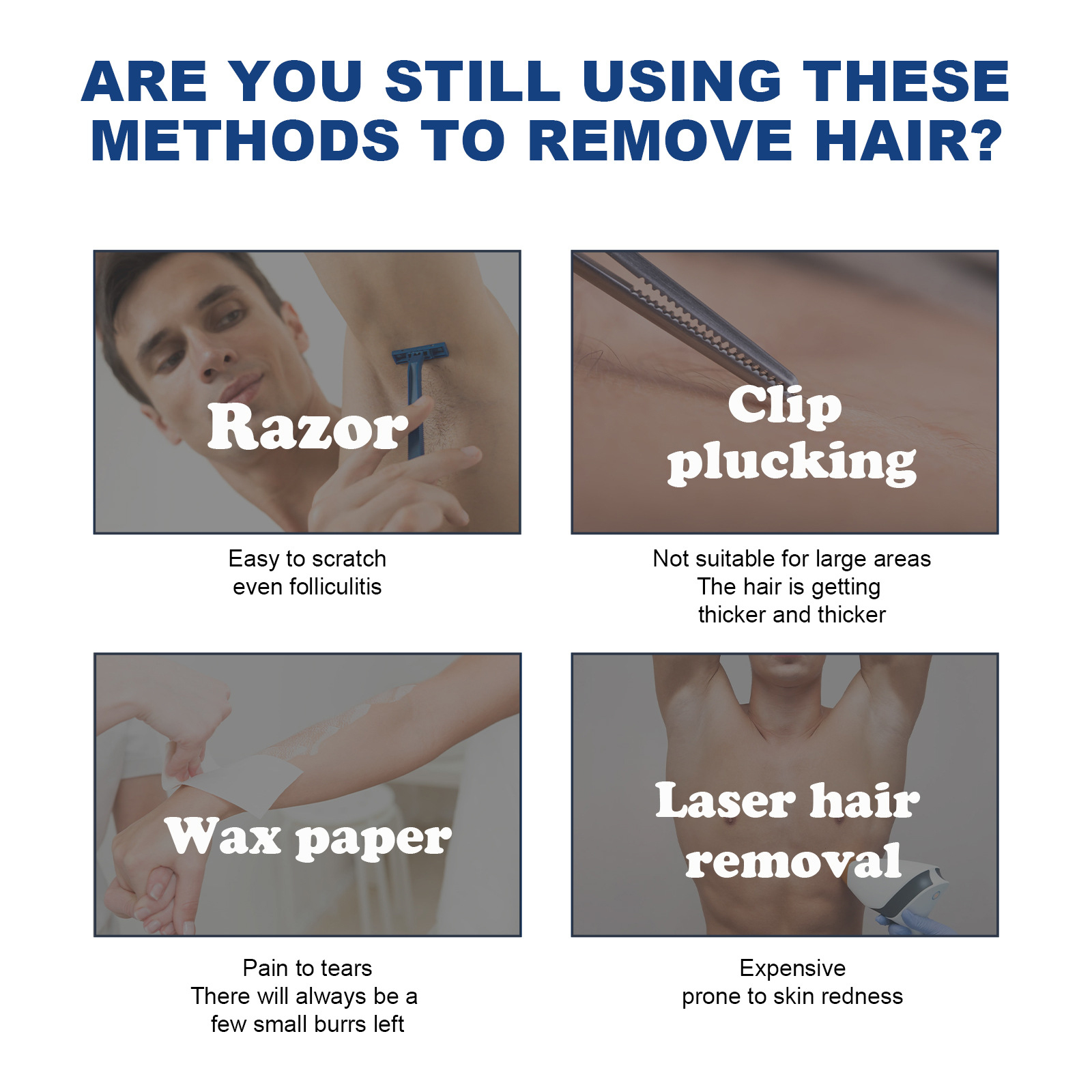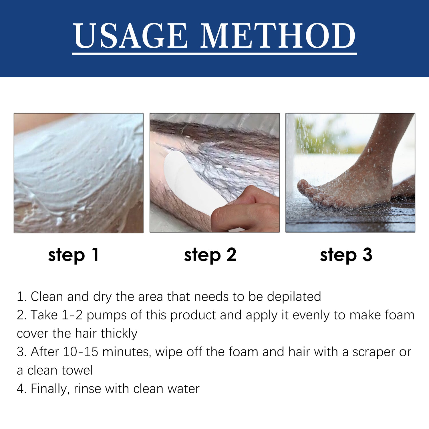 Our men's hair removal foam spray contains calcium hydroacetate, glycerin, and honeysuckle extract. It removes hair quickly and painless. It can remove body hair from the roots in less than 15 minutes, keeping the skin smooth. Its use method is very simple: 1. Clean and dry the parts that need hair removal; 2. Usage: Take this product 1-2 times, evenly apply, so that the foam thick cover hair; 3. After 10-15 minutes, wipe off the foam and hair with a scraper or clean towel; 4. Finally, rinse with water. This product is for men, gentle and effective, does not damage the skin. More effective than regular hair removal creams and can break down thicker and coarser hair. Women can also use it on areas with more hair.