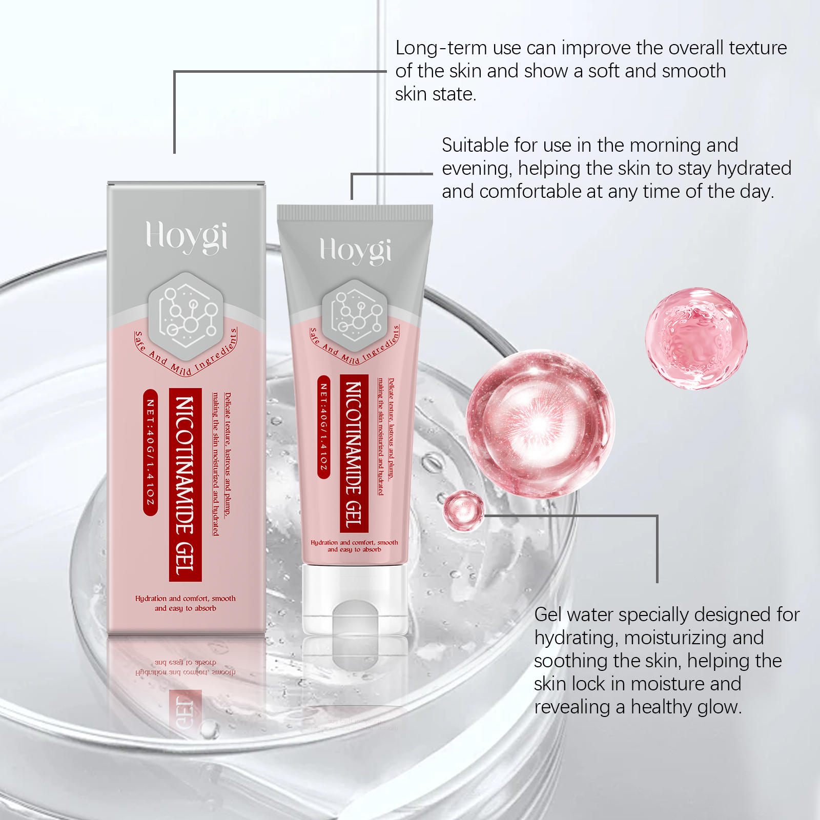 Our niacinamide gels contain glycerin, niacinamide, and hyaluronic acid. It penetrates deep into the skin, providing a powerful moisturizing effect that helps the skin retain moisture, reduces dryness and fine lines, and keeps the skin soft and smooth. Its application method is simple: 1. Clean facial skin and keep it dry. 2. Apply appropriate amount of the product evenly on the face. 3. Gently massage until absorbed. Niacinamide has a soothing effect on the skin, which helps to reduce the irritation of the external environment on the skin, maintain a healthy balance of the skin, and make the skin feel comfortable and relaxed.