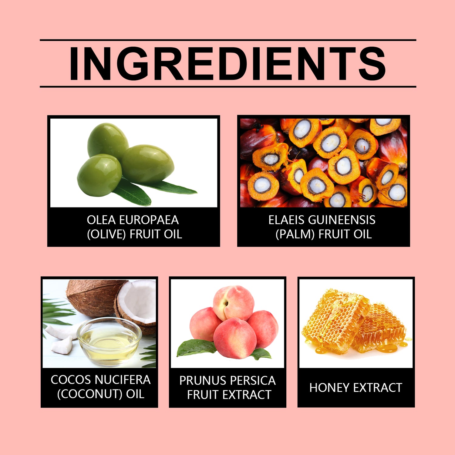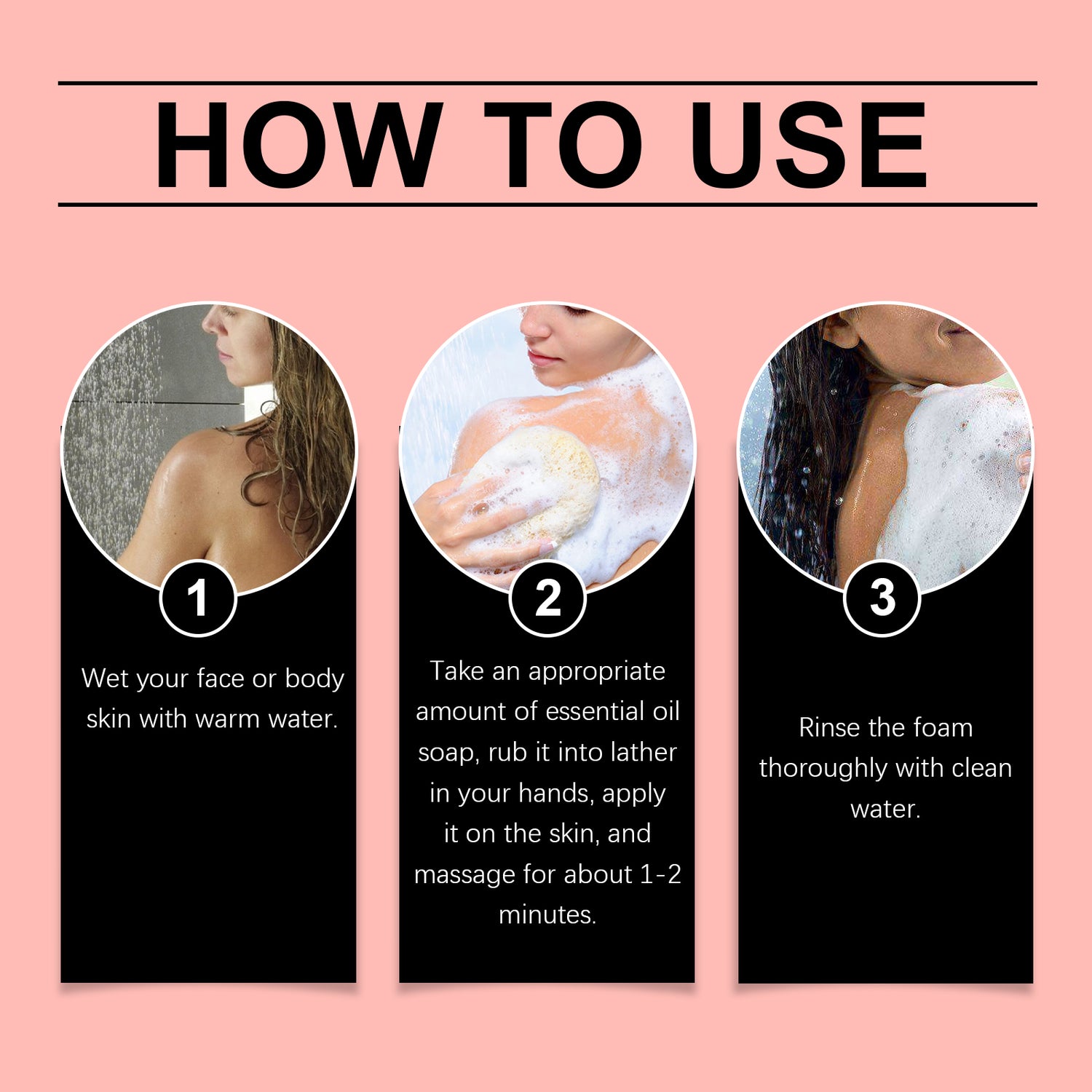 Our peach essential oil soap contains peach extract and honey extract. It can bring a light aroma and make the use experience more pleasant. Its use is simple: wet the skin of the face or body with warm water. Take appropriate amount of essential oil soap, knead it into a foam and massage it on the skin for about 1-2 minutes. Rinse the foam thoroughly with water. It also locks in moisture and prevents dry skin.