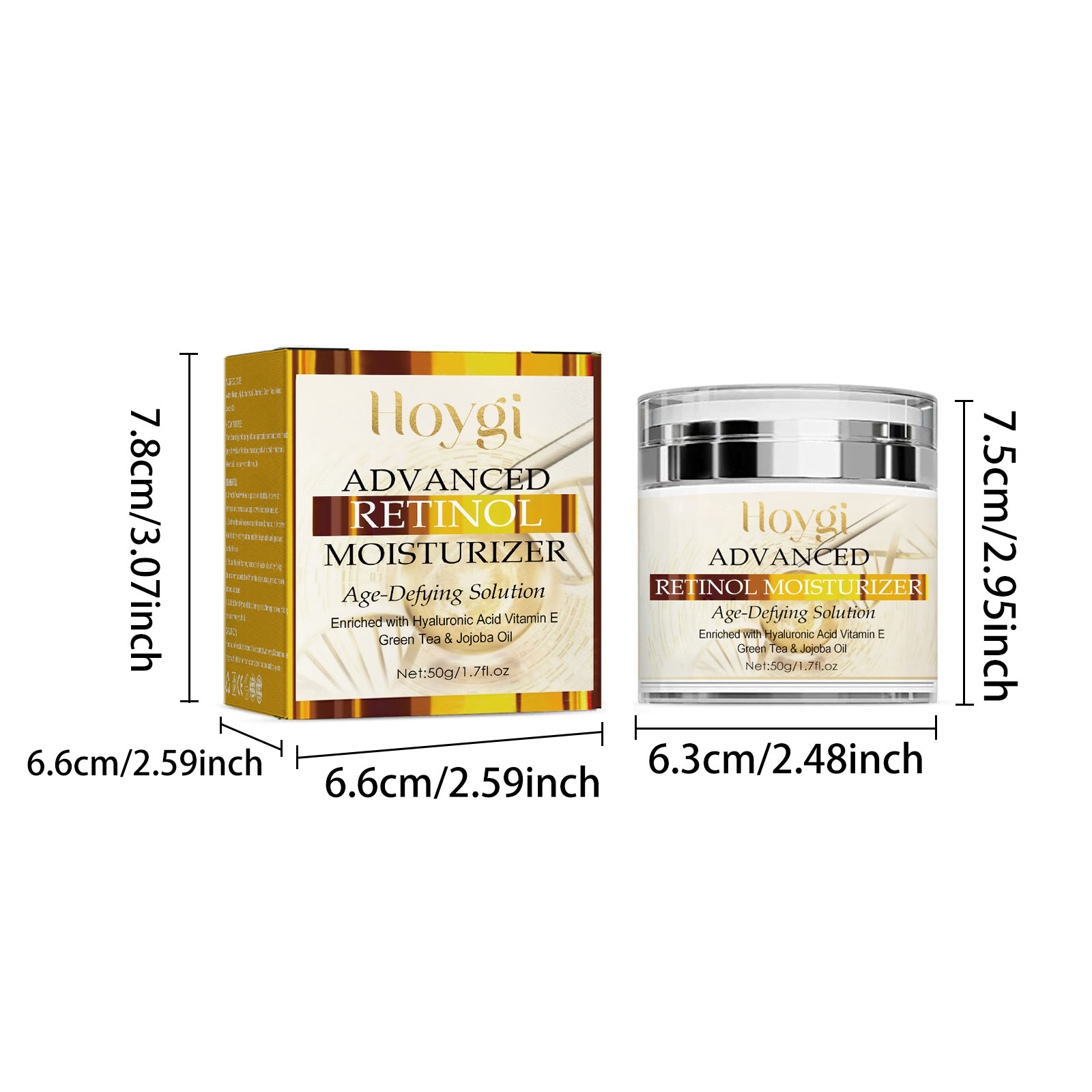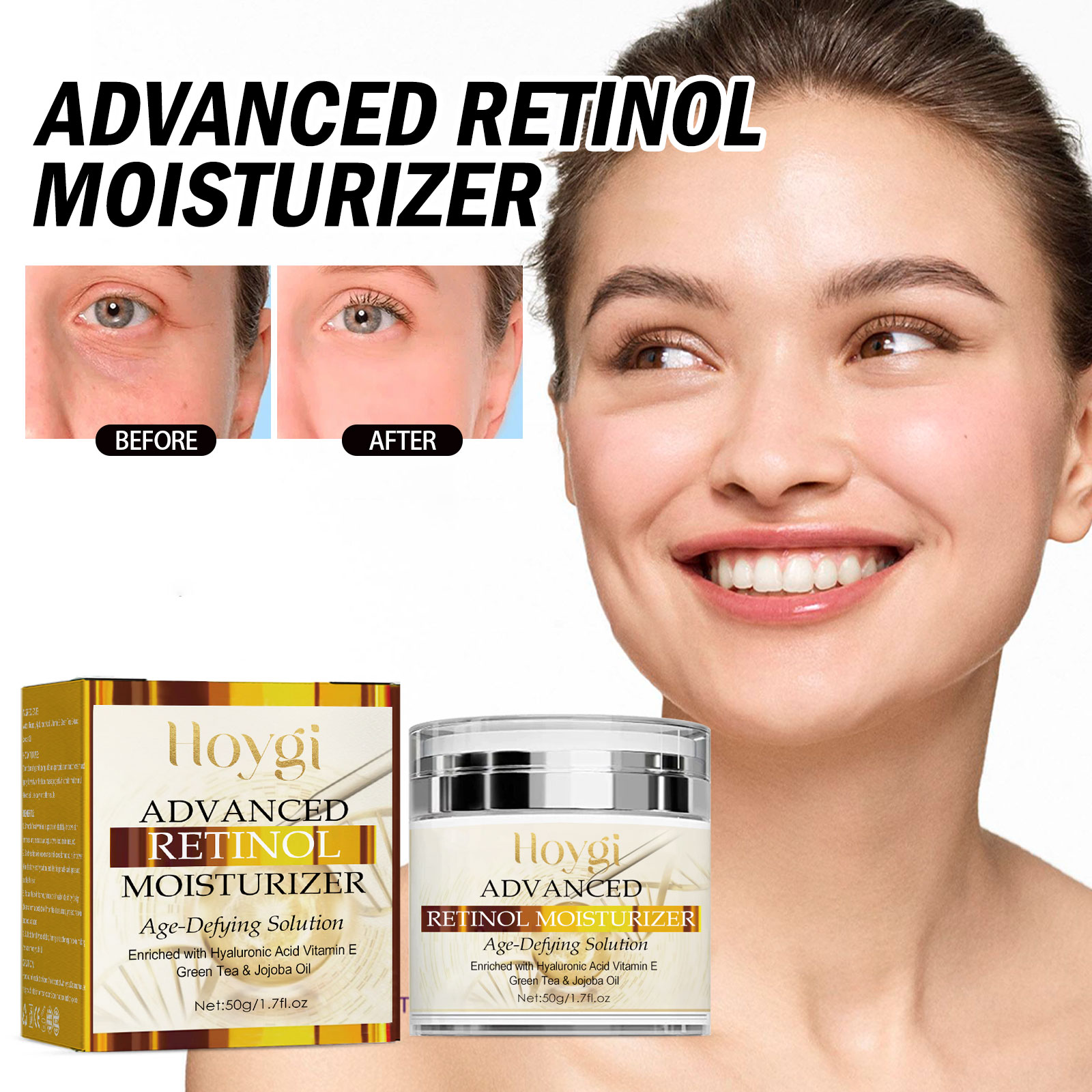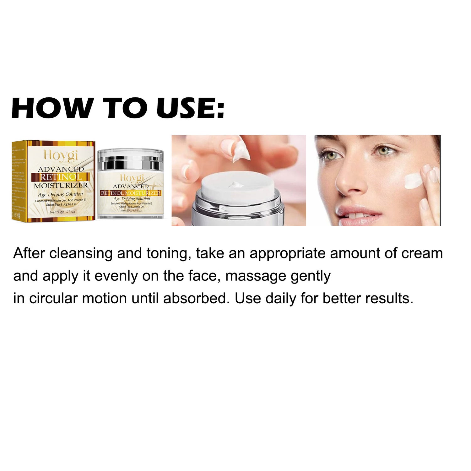 Our retinol cream contains retinol, hyaluronic acid, vitamin E. It can remove the signs of age, smooth fine lines, anti-wrinkle, increase skin moisture, promote collagen production, naturally improve and firm skin, making skin smoother, brighter and healthier. Its use method is very simple: after cleansing and toning, take appropriate amount of cream evenly apply on the face, gently massage in a circular motion until absorbed. Use daily for better results. Retinol cream is anti-aging, smoothing wrinkles, correcting dark spots, repairing damaged skin cells, and obtaining a bright skin tone.