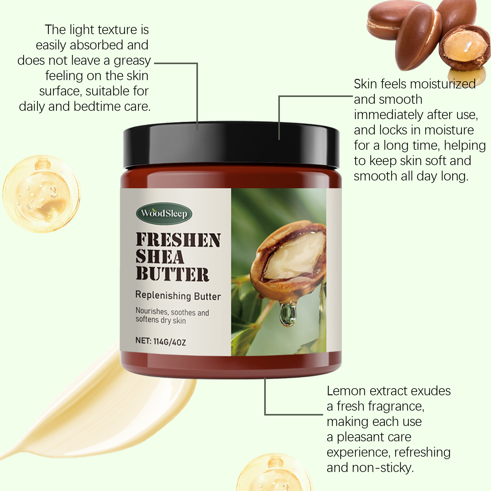 Our shea butter contains glycerin, shea butter, olive oil. It provides a deep moisturizing effect, helping to lock in skin moisture, preventing dryness, peeling and roughness, and keeping skin hydrated and soft all the time. The way to use it is simple: 1. Clean the face and body and keep dry. 2. Apply appropriate amount to face and body. 3. Gently massage until absorbed. Lemon essence has the effect of brightening skin, helping to improve dull skin problems, even out skin tone, and give skin a healthy glow.