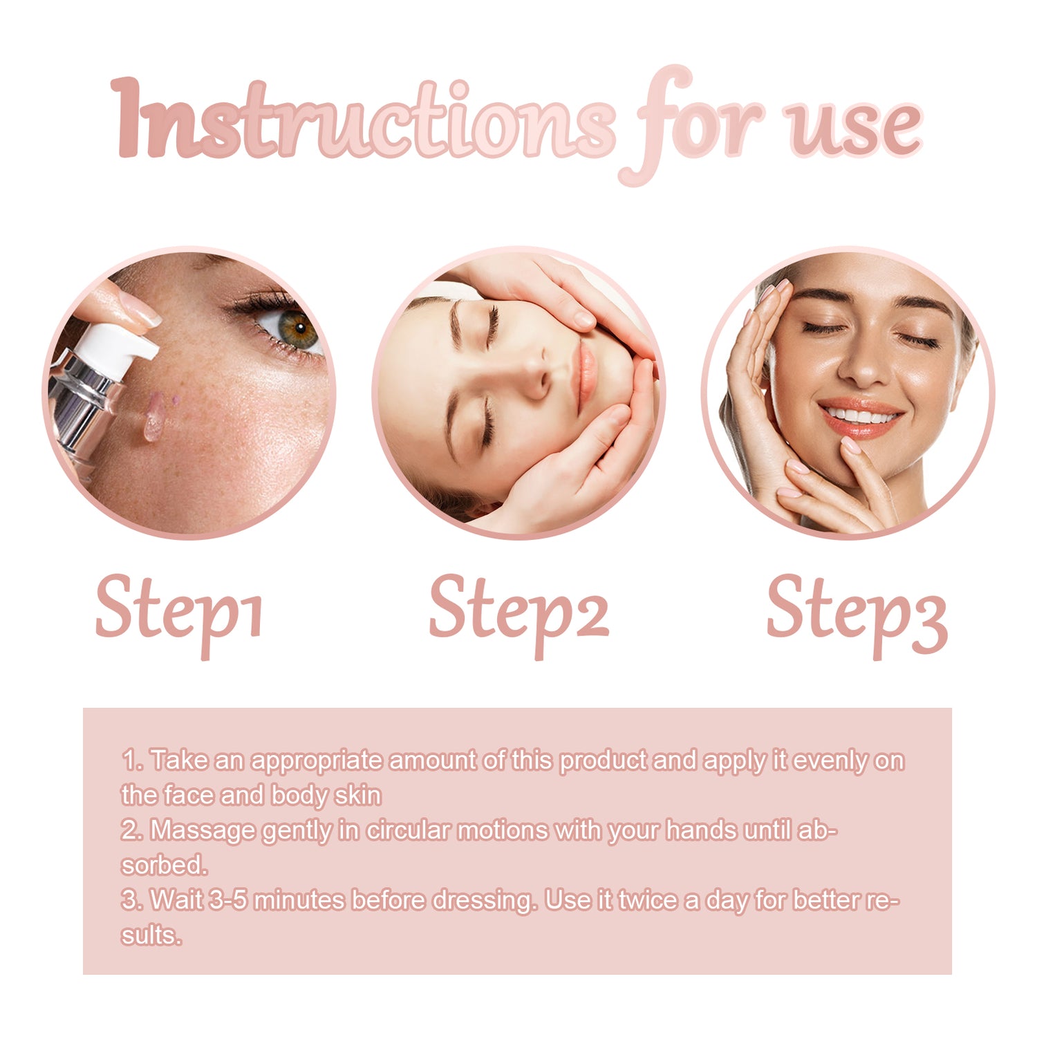 Our Smoothing body serum contains cherry blossom extract, Centella asiatica extract, hydrolyzed collagen. It can easily turn black physique, difficult to turn white again; Skin wrinkles, skin loosens, collagen is lost; Dry skin is exposed to the sun for a long time, without timely care, dry and flaking; Large pores Pores are not cleaned properly, and dirt accumulation leads to large pores and rough skin. Its use method is very simple: apply appropriate amount of this product evenly on the face and whole body skin, gently massage with your hand in a circular motion until absorbed, wait 3-5 minutes before dressing. Use twice a day for better results. Skin armpit whitening, moisturizing relieve dry, fresh, moist and full, deep penetration into the skin, reduce wrinkles and wrinkles.