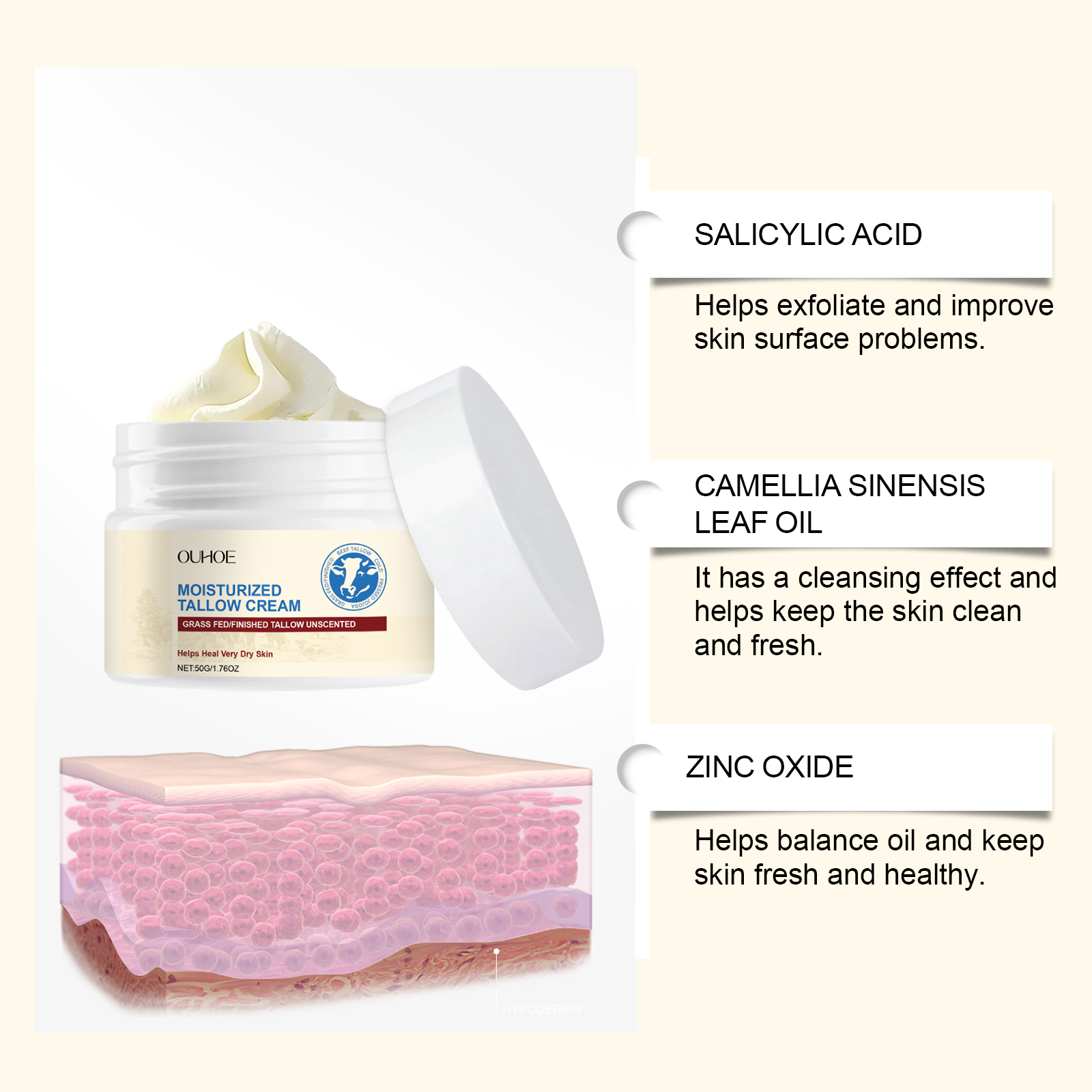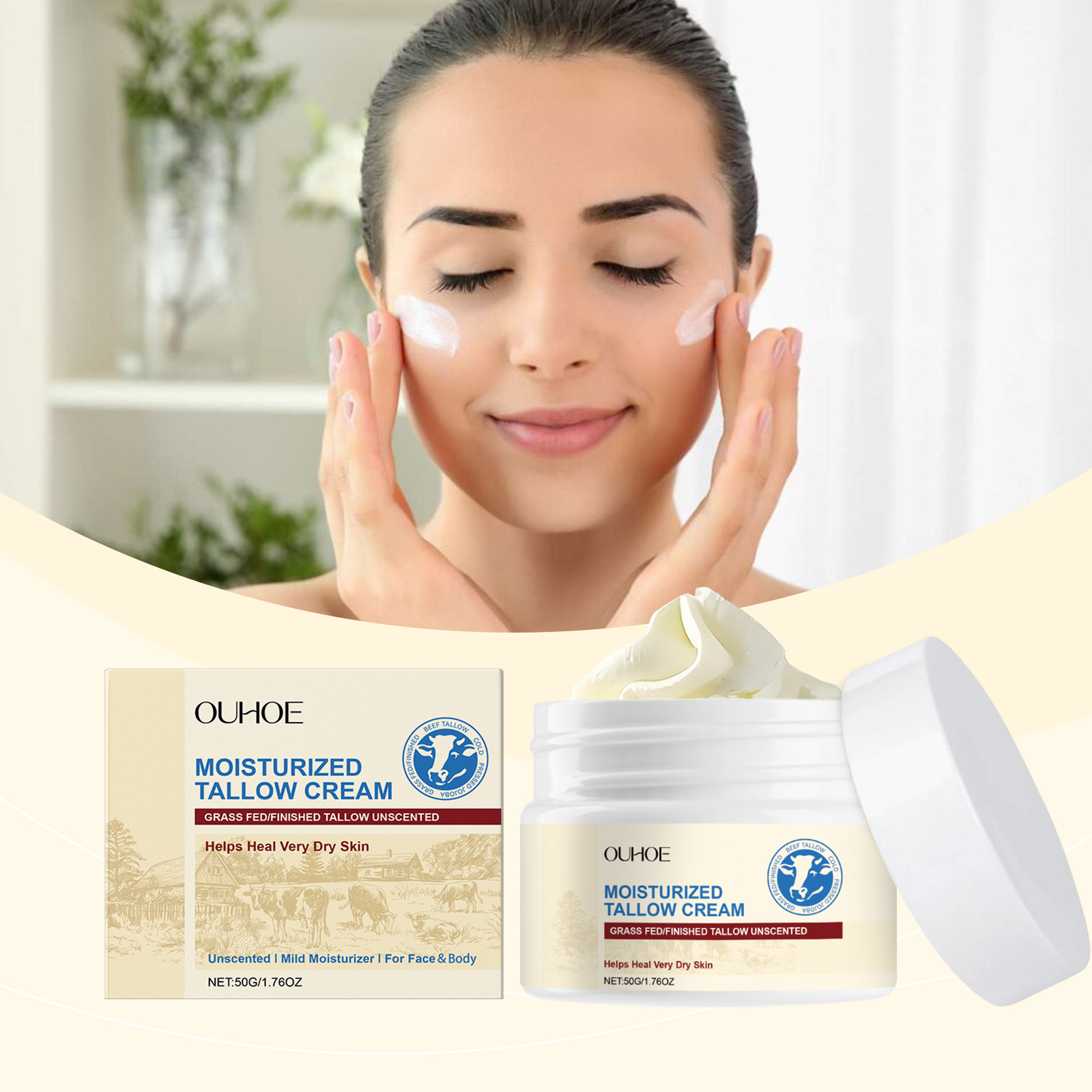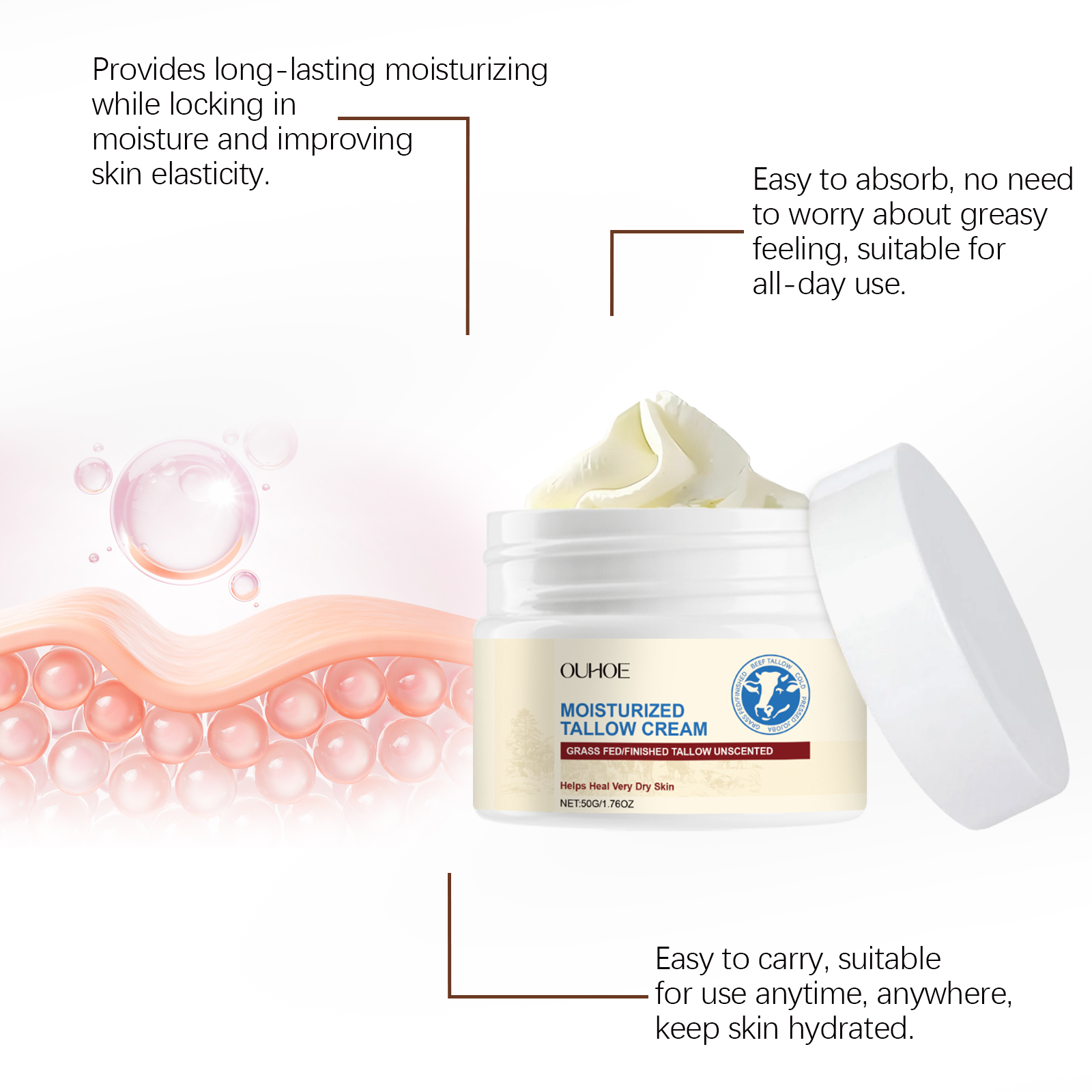 Our tallow moisturizer contains vitamin E, tallow and Jojoba oil. It can effectively moisturize the skin, help lock in moisture, and enhance skin smoothness. Its application method is very simple: 1. Please clean your face before use to ensure that your skin is clean. 2. Apply proper amount of cream to the forehead and cheeks with clean fingers. Nose and chin. 3. Massage gently with your fingertips for a few minutes to promote absorption. A highly effective moisturizing ingredient that provides long-term hydration and keeps skin hydrated throughout the day.