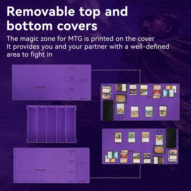 Has a fully removable top cover (and bottom cover) attached by powerful magnets. The top cover is printed with Magic: The Gathering's zone, and can serve as a playmat for MTG games.