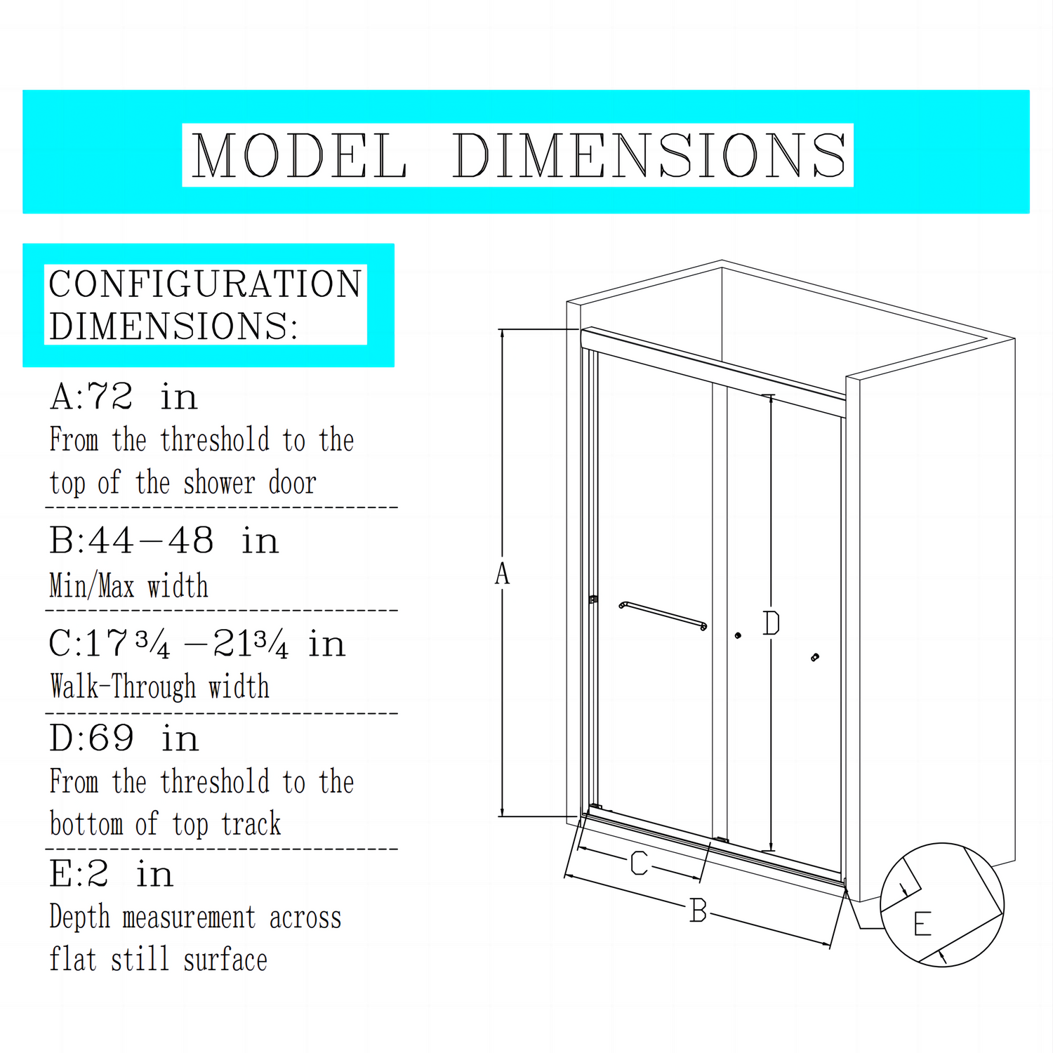 • DOUBLE BYPASS SLIDING: This 48 in W * 72 in H semi-frameless shower door can be adjusted to 44 and 48 in width by cutting, walk-through width adjustment range: 17.75 in. to 21.75 in, maximize your bathroom layout of our double sliding door system, designed for easy access while using minimal space for smooth. The door body is light and flexible, reversible installation of left and right panel, and provides smooth opening and closing.