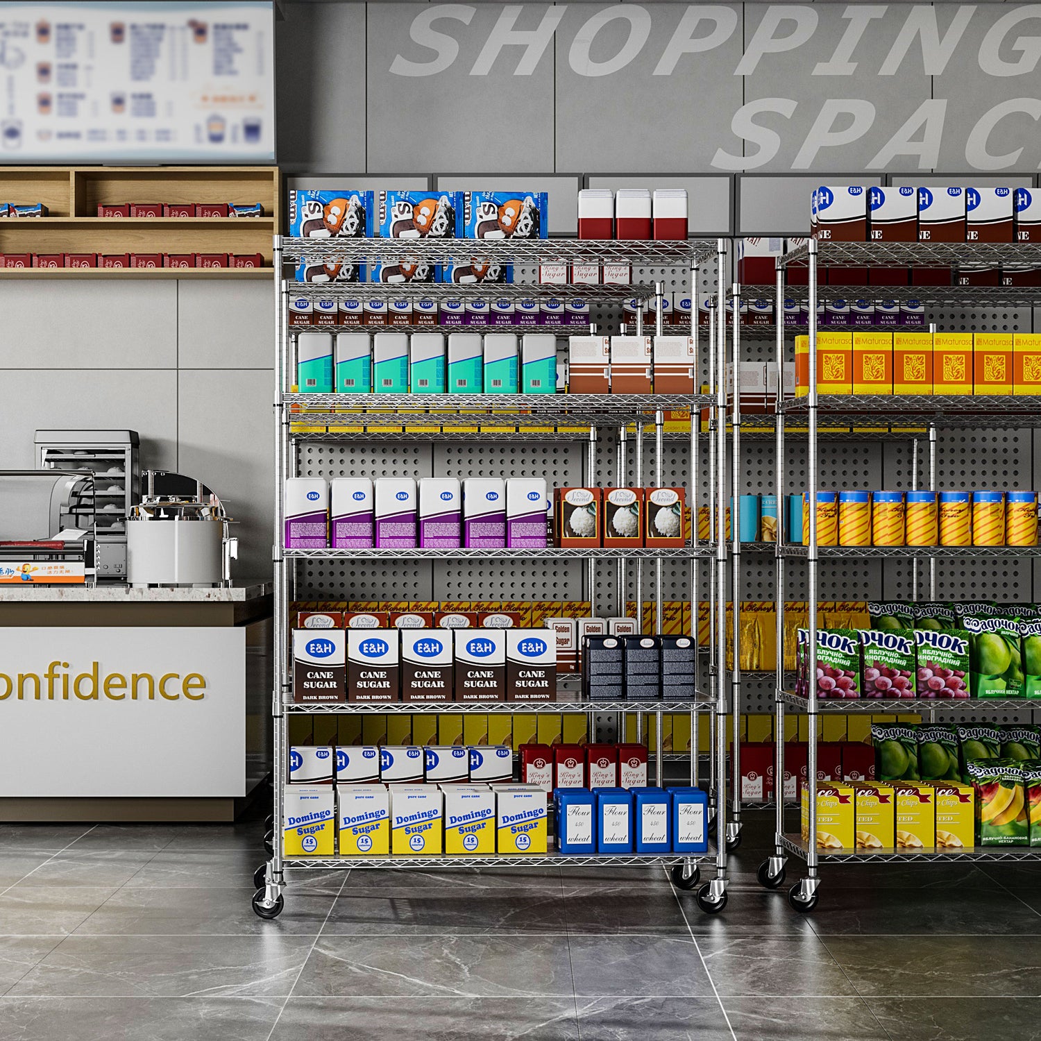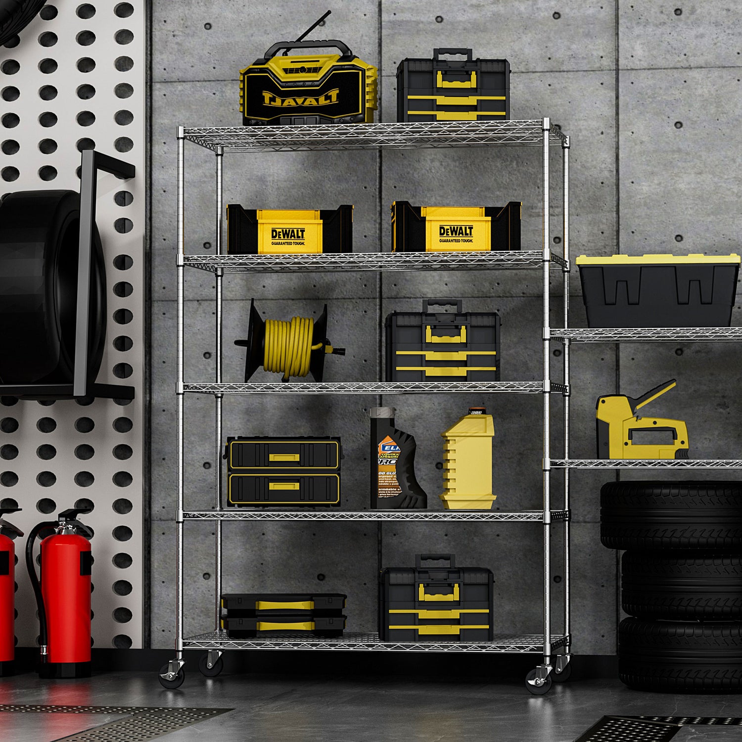 [5 TIER LARGE CAPACITY] - Heavy duty shelving with leveling feet - each layer shelf can hold 1200lbs (evenly distributed), maximum load capacity is 6000lbs. It is recommend that heavy items on the bottom shelf for maximum stability. 5 shelf Liners choice of beautiful and fun transparent colors allow you to add a pop of color to your life. Shelf liners is waterproof - Won't get damaged from exposure to moisture. [STURDY & EXTREMELY DURABLE] - Wire shelving made of heavy steel, it has excellent rust resistance and oxidation resistance. Our wire shelf liner is crafted to provide unparalleled quality, longevity, function and beauty. Better quality thicker than the competition. The 5 tier shelf unit passed NSF certified, safe and reliable. Storage rack are perfect addition to home, office, garage. [ADJUSTABLE DESIG] - Each shelf can adjustable in 1-inch increments, adjust the shelf height according to size of the item, meet your different needs, get the best utility shelf. Create two new shelf by splitting the top pole, you can split it according to your actual needs and achieve multiple uses. [EASY MOVEMENT] - 5 tier garage shelves have 4 leveling feet, 4 4-inch industrial wheels(2 lockable). Wire rack on wheels can be easily positioned in supermarkets, garages, closets, kitchens, porch, pantry, etc. Height-adjustable leveling feet can be placed on uneven ground- simply twist to stabilize. Non-slip, will not scratch ground. [EASY TO ASSEMBLE] - With detailed instructions and no tools required, you can install it easily with another person within 15 minutes. There are many parts in the package, please feel free to contact us via buyer message if meet the case of missing parts and assembly.