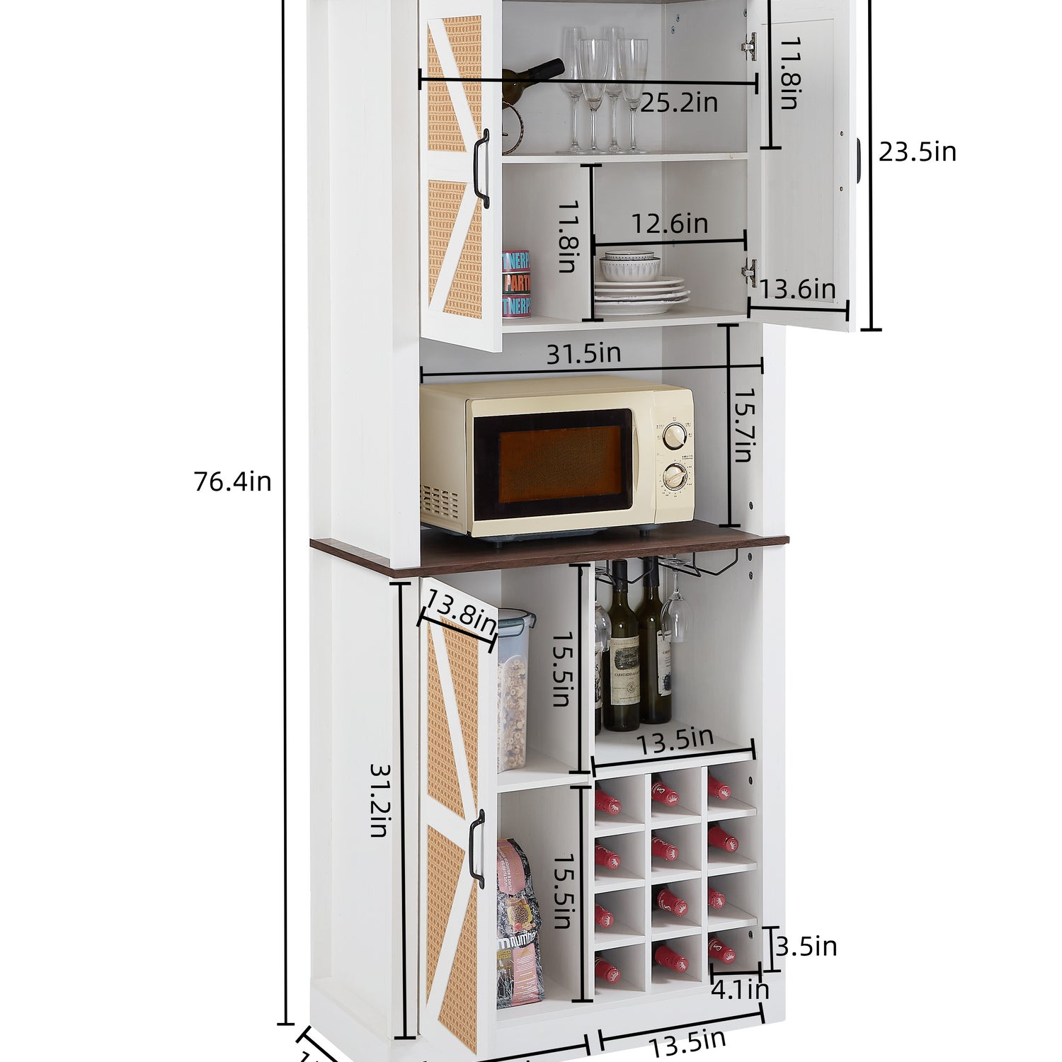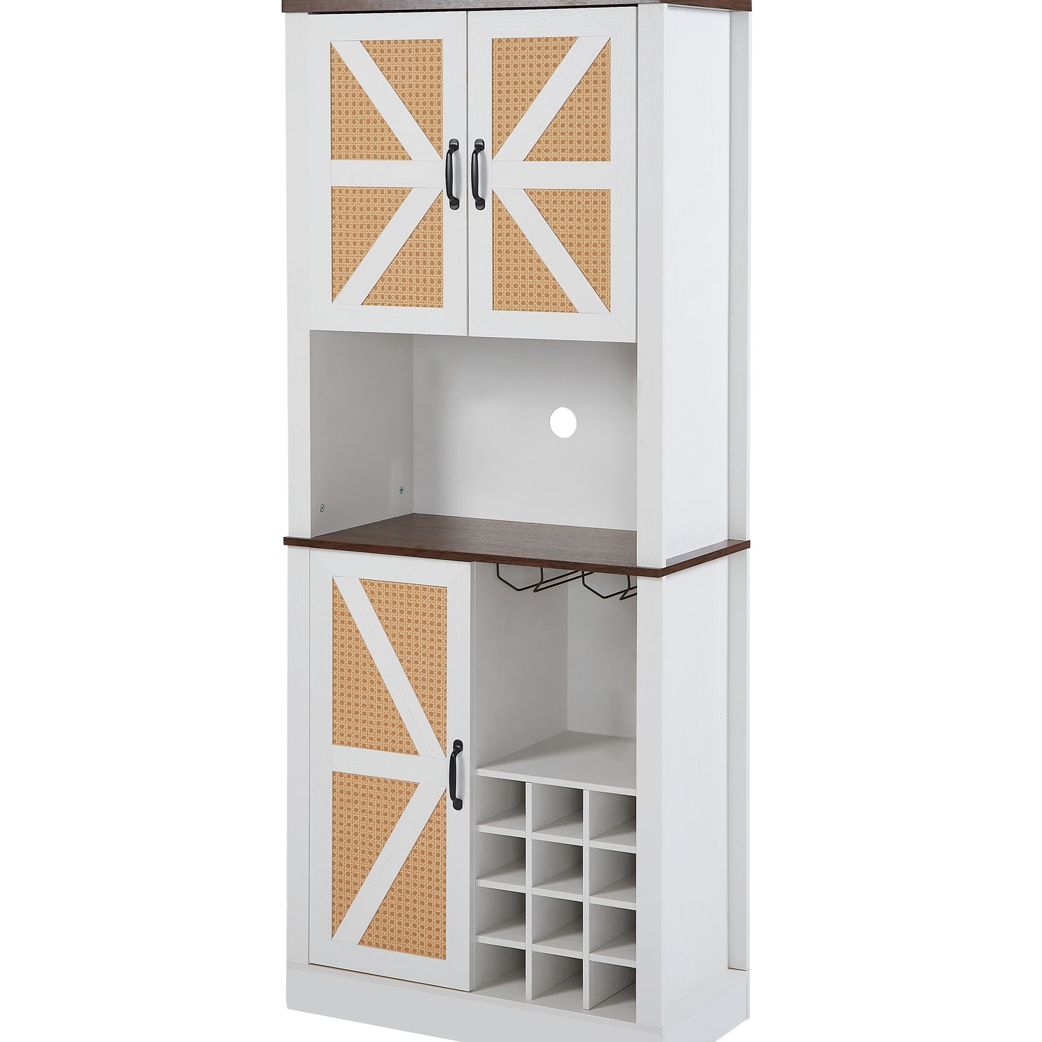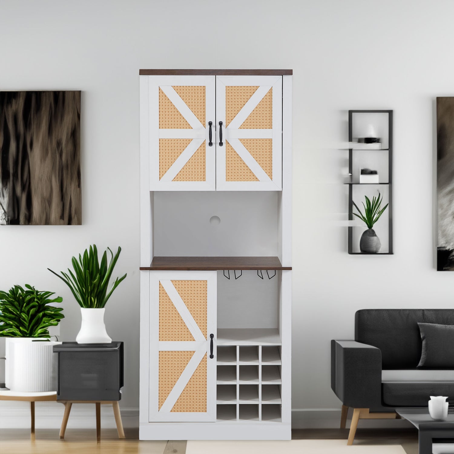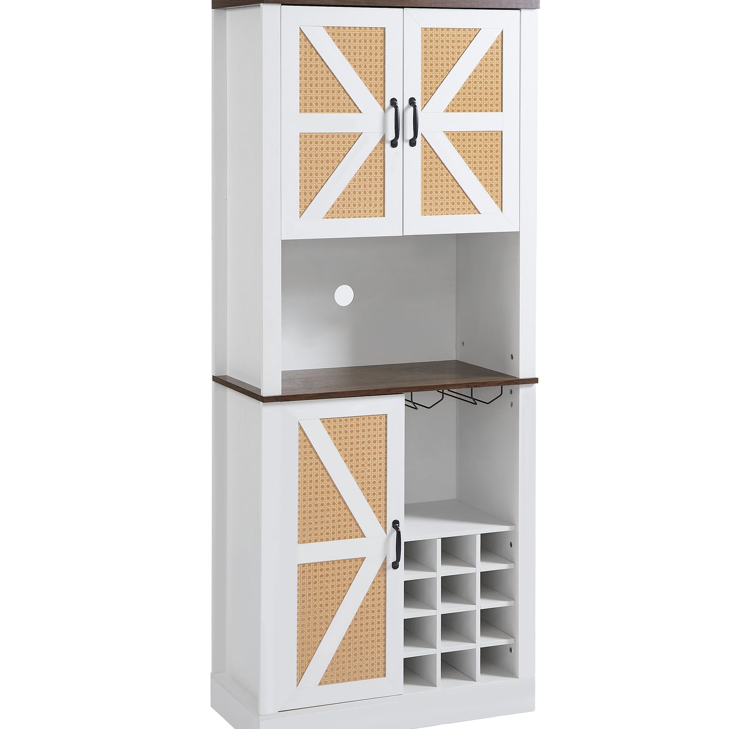 76 Inch Tall Farmhouse Kitchen Faux Rattan Wine Cabinet, Kitchen Bar Cabinet with Square Compartments and Shelves