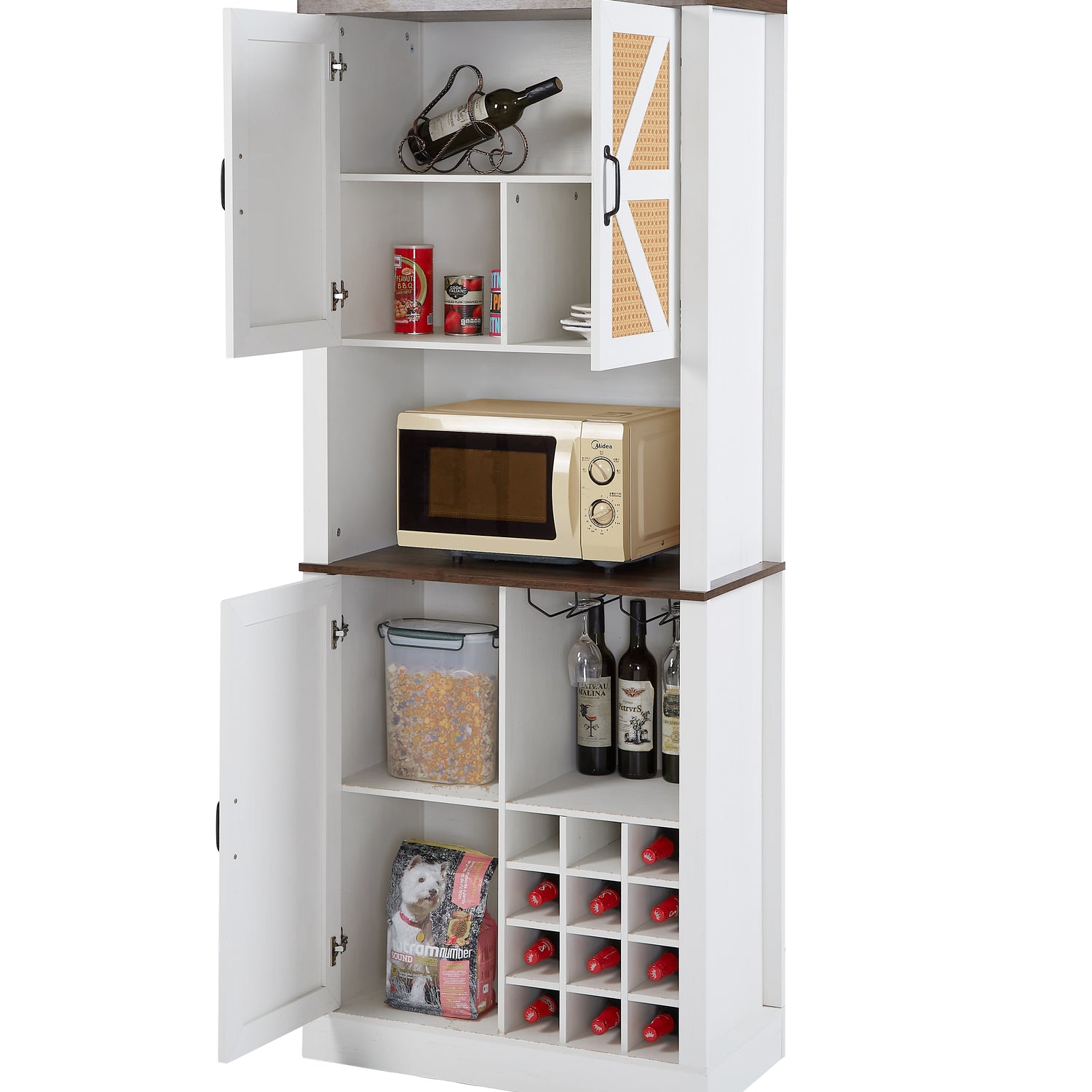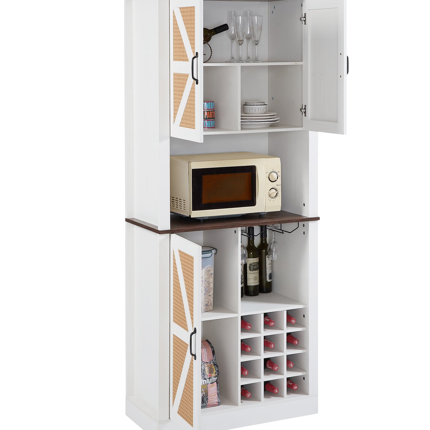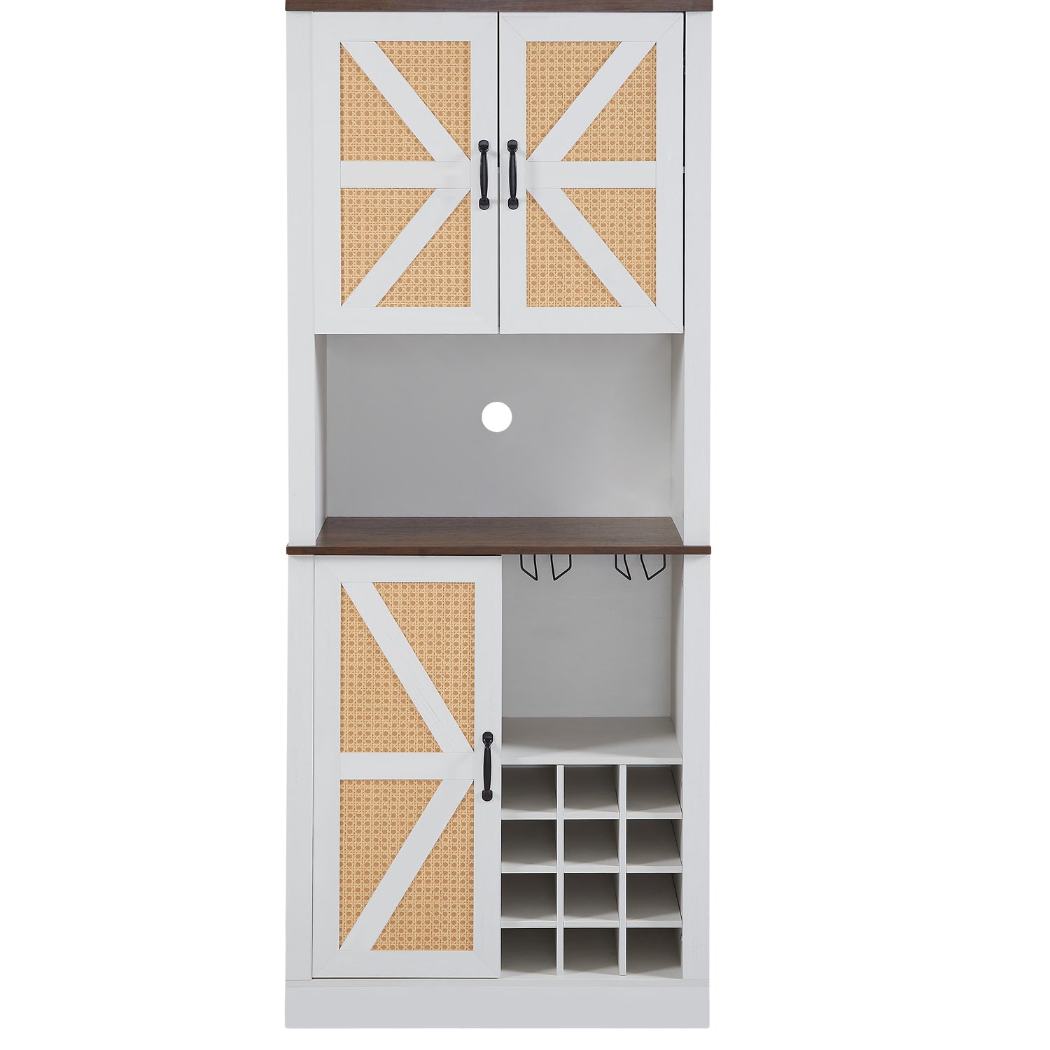 76 Inch Tall Farmhouse Kitchen Faux Rattan Wine Cabinet, Kitchen Bar Cabinet with Square Compartments and Shelves - White+Walnut is backordered and will ship as soon as it is back in stock.