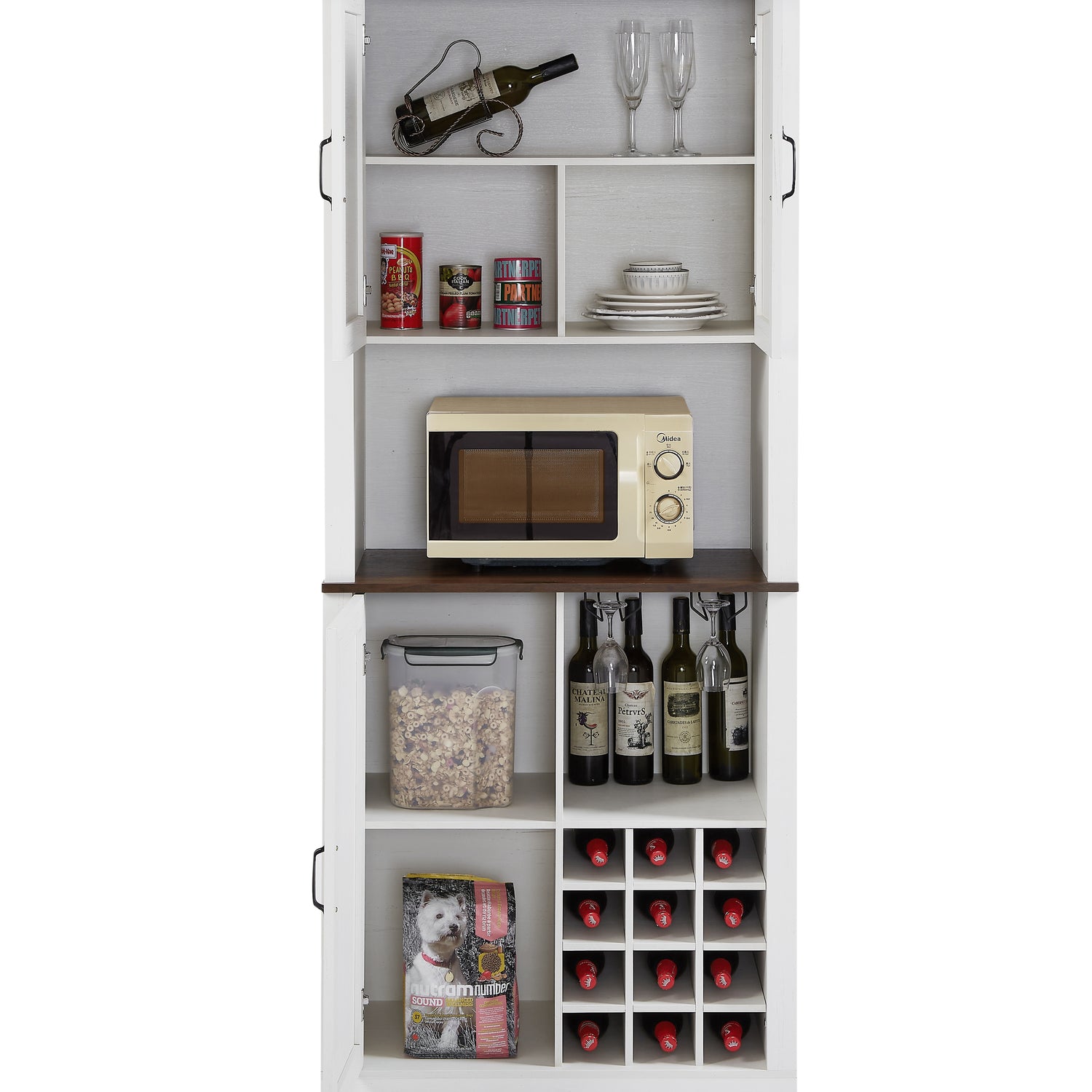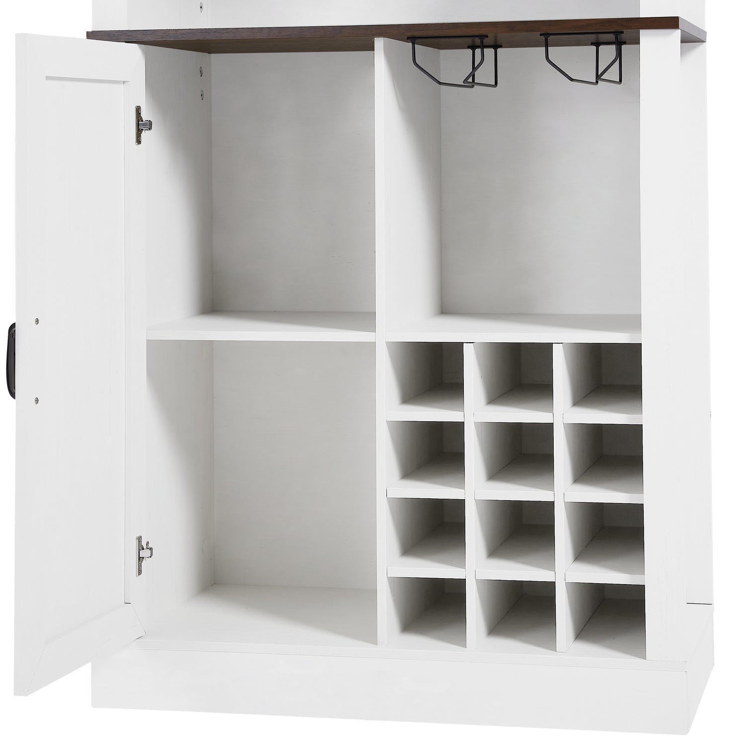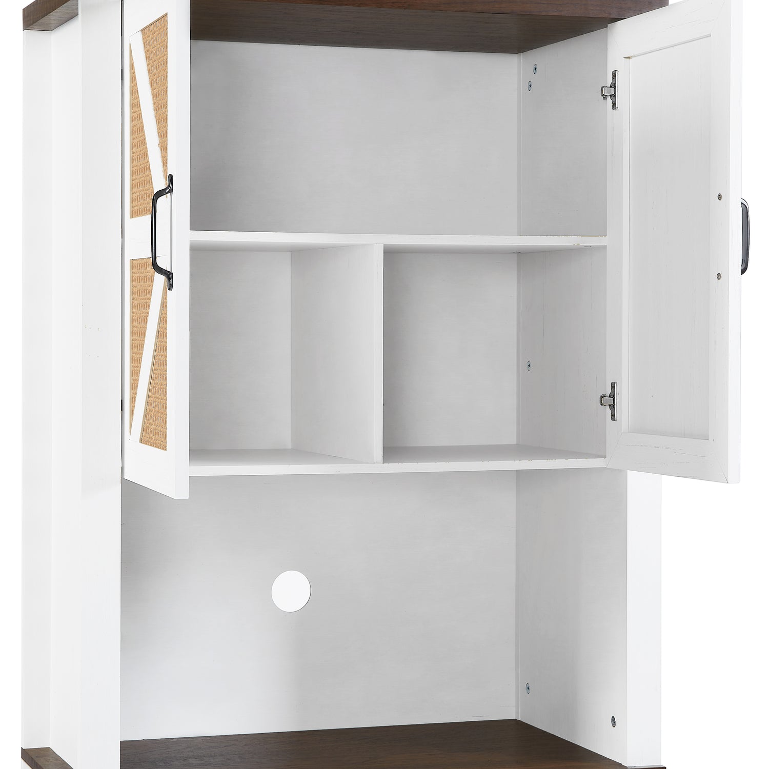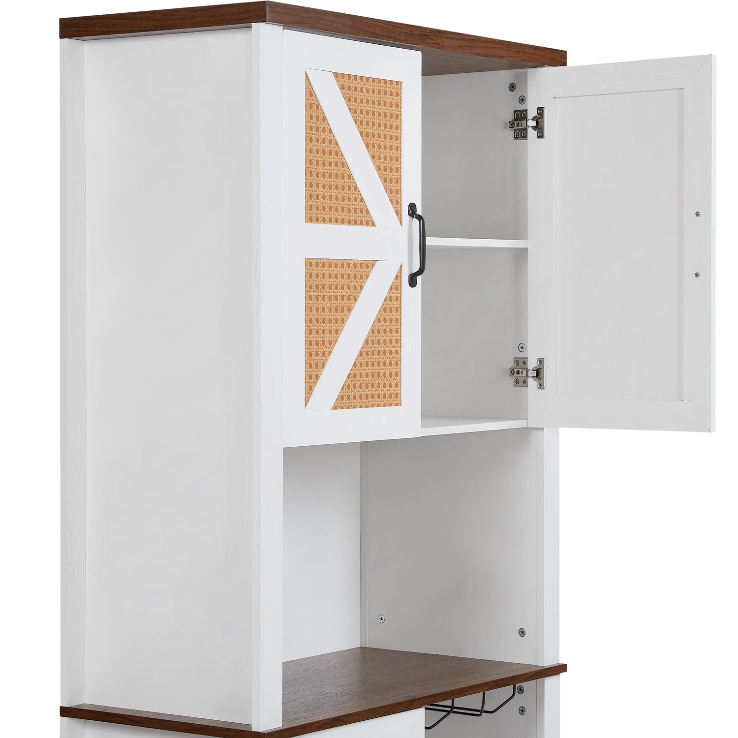 76 Inch Tall Farmhouse Kitchen Faux Rattan Wine Cabinet, Kitchen Bar Cabinet with Square Compartments and Shelves - White+Walnut is backordered and will ship as soon as it is back in stock.
