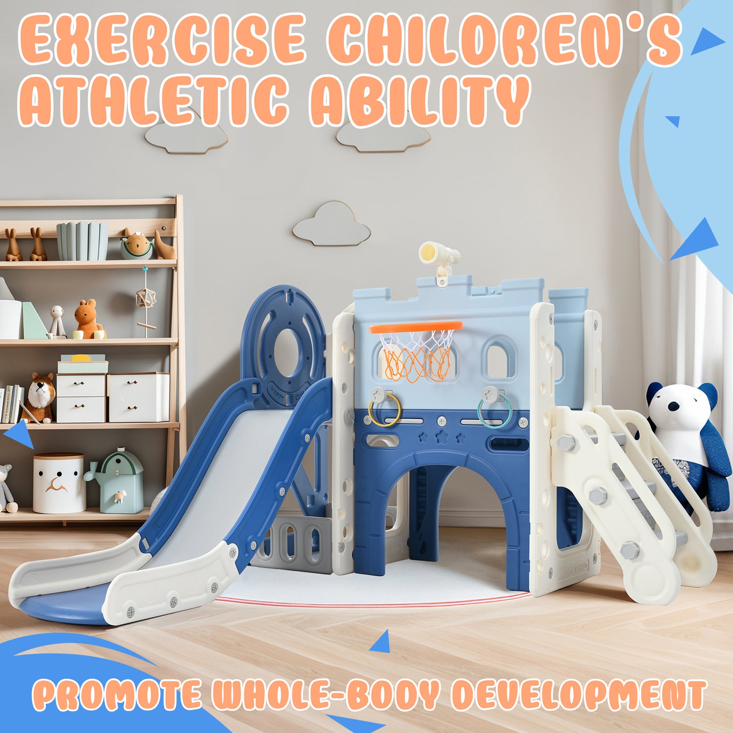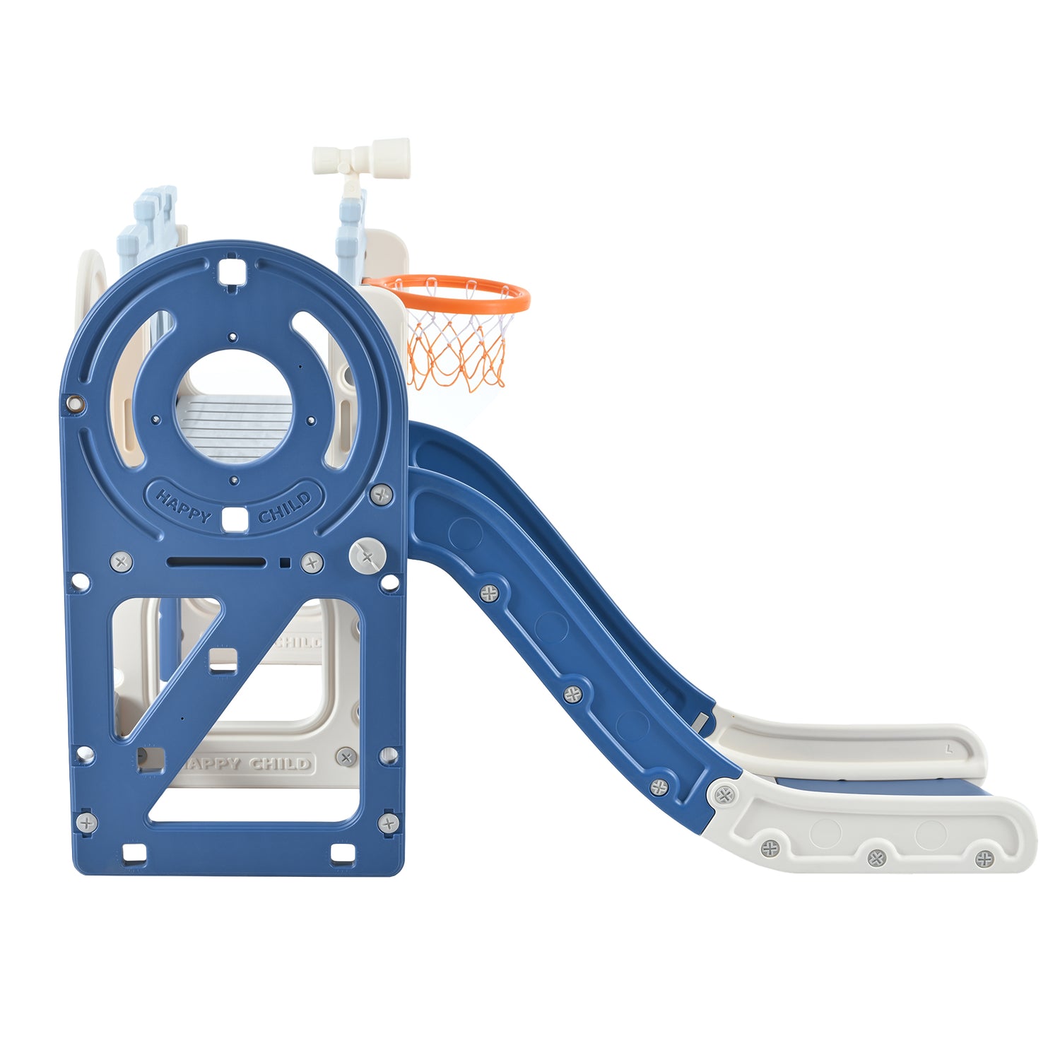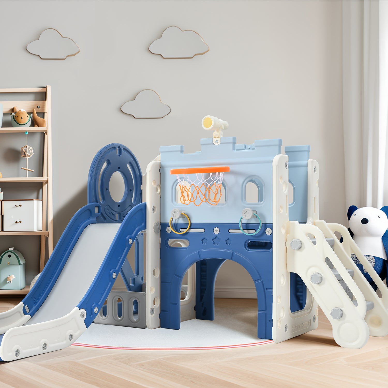 9-1 Toddler Slide Set,Kids Slide for Toddlers Ages 1+, Basketball Hoop, Tunnel and Storage Space, Pirate Ship Themed Slide - Blue+HDPE+Cute is backordered and will ship as soon as it is back in stock.