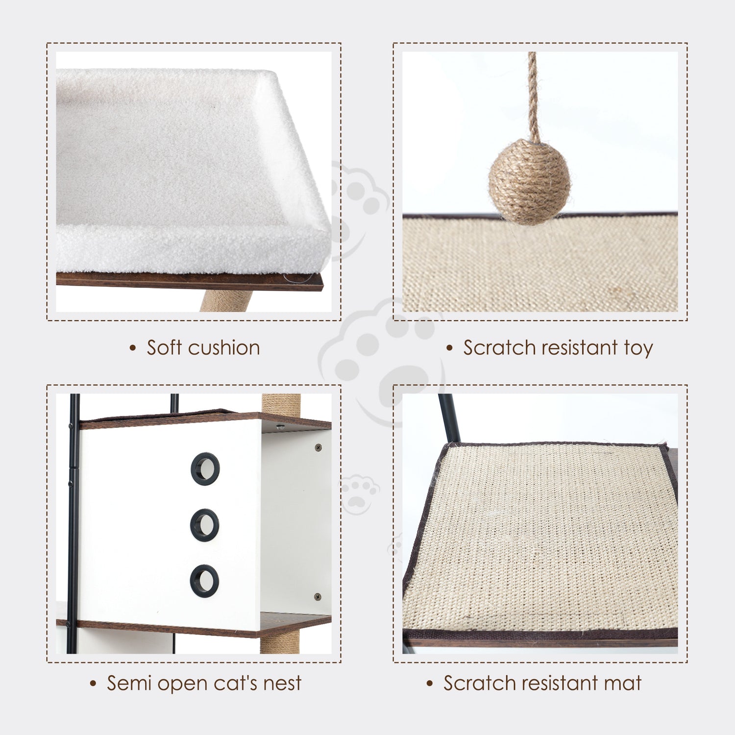 4.Thoughtful Details: Platforms for sogespet cat tower condo are equipped with cat scratching pads which can effectively prevent cats from slipping and falling. At the top is a soft line bed to give your cat a comfortable sleep without disturbances.