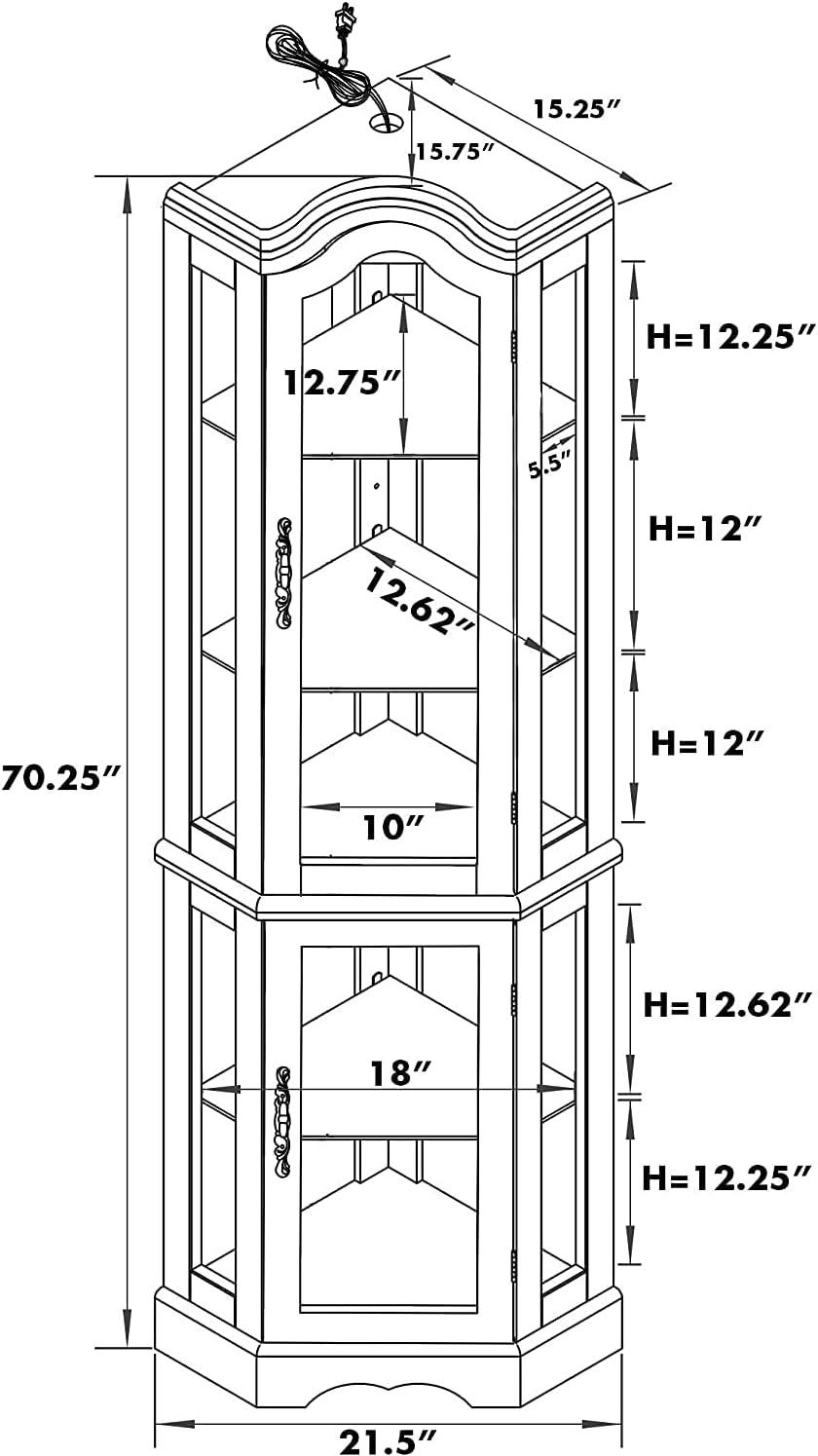 • 【Adjustable Shelves】:This lighted corner curio cabinet offers 2 fixed shelves and 3 tempered glass shelves, which is best for valuable or fragile items.The tempered glass shelves can also be removed if you would like to display taller items. Overall Dimensions: 70.25"H*21.5"W*15.75"D, Holds up to 125 lbs. Each of the shelves can hold up to 25 pounds of distributed weight.