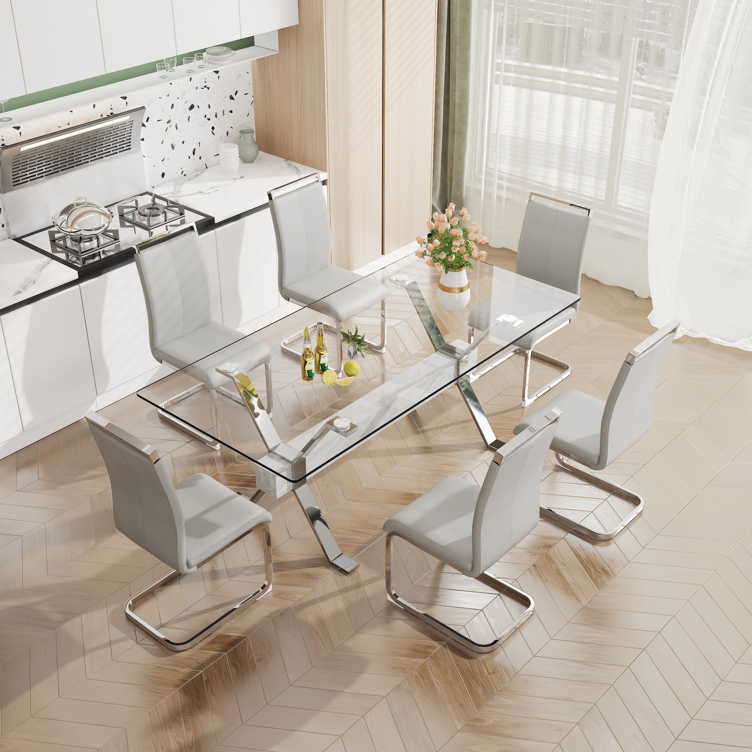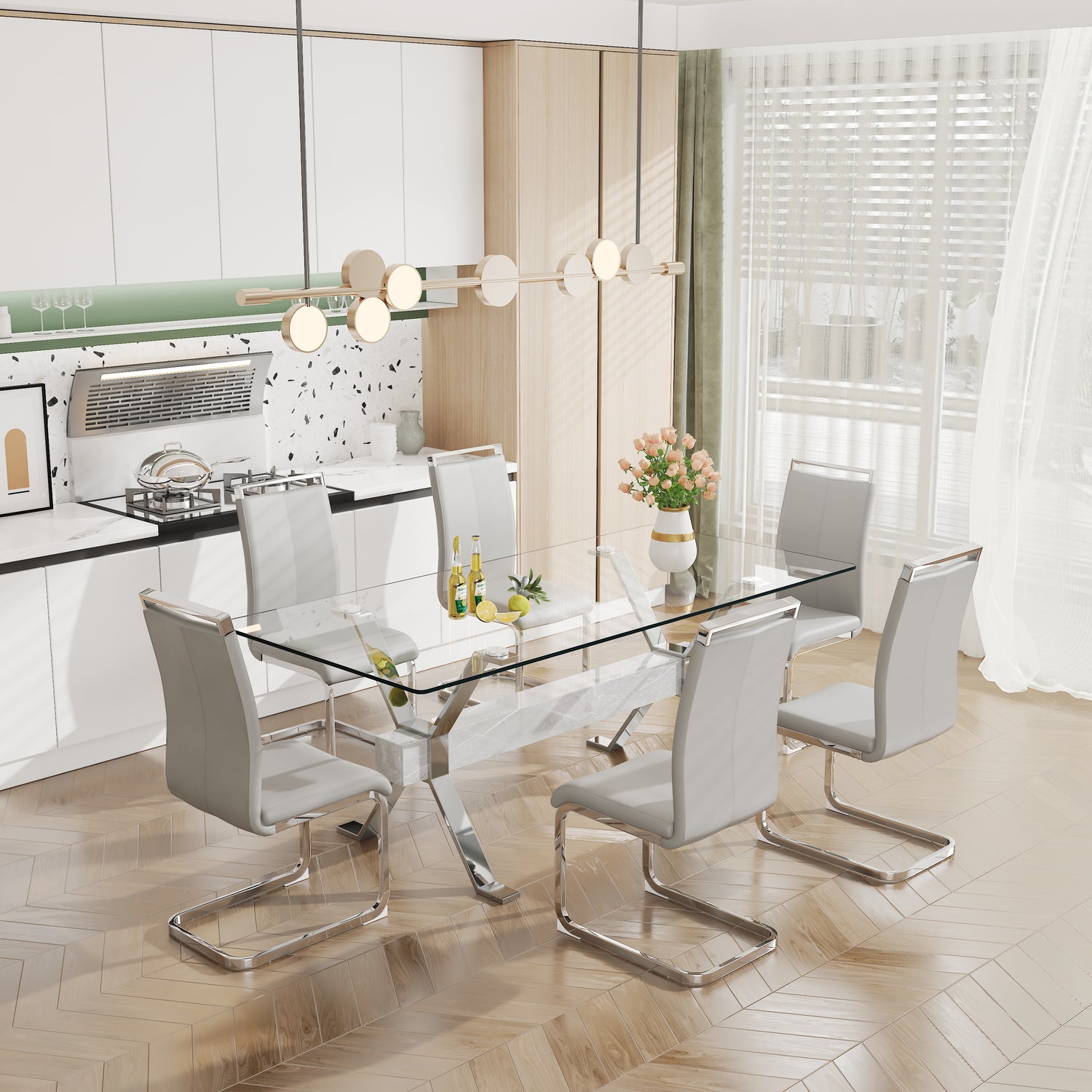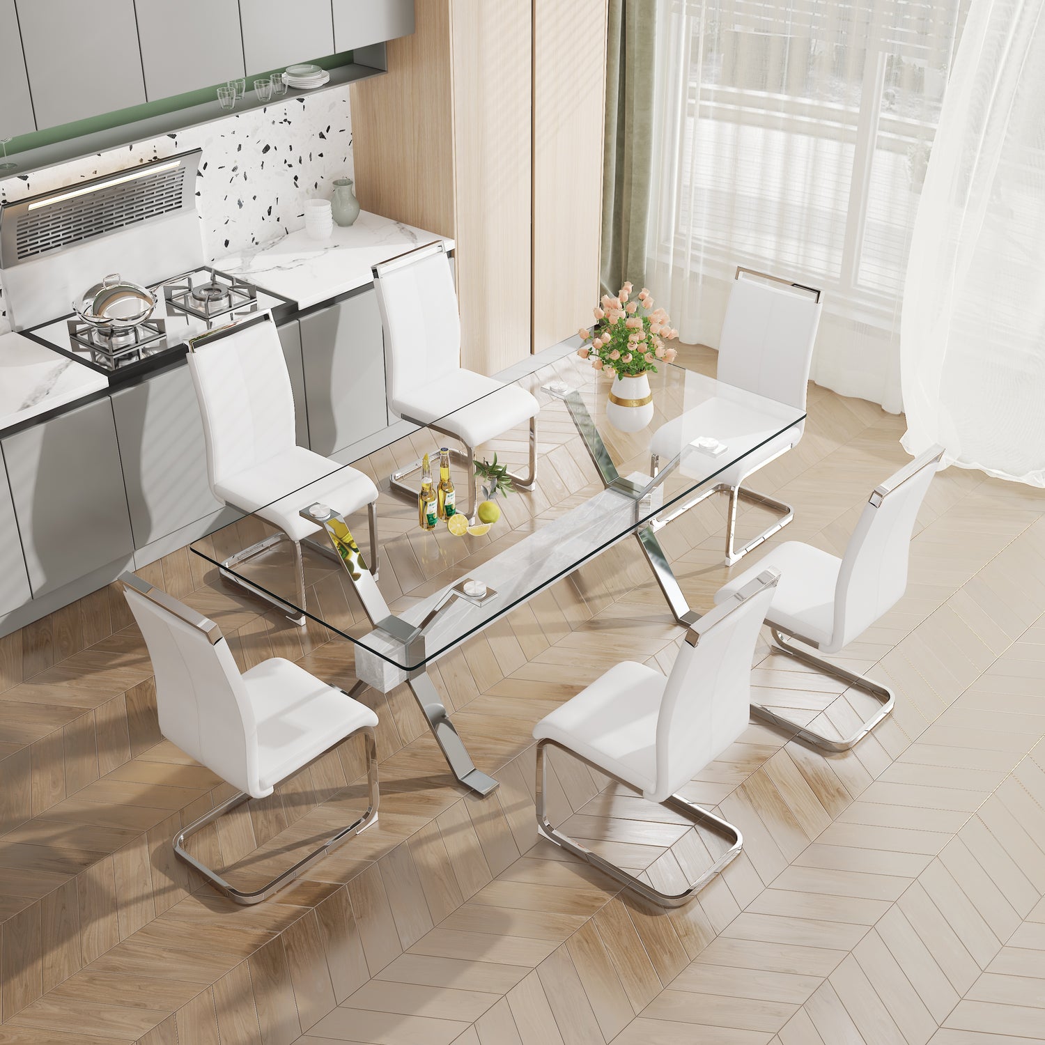 Product Name:Dining table. Modern tempered glass dining table. Large modern office desk with silver plated metal legs and MDF crossbars, suitable for both home and office use. Kitchen. 79 ''x39''x30 '' 1105