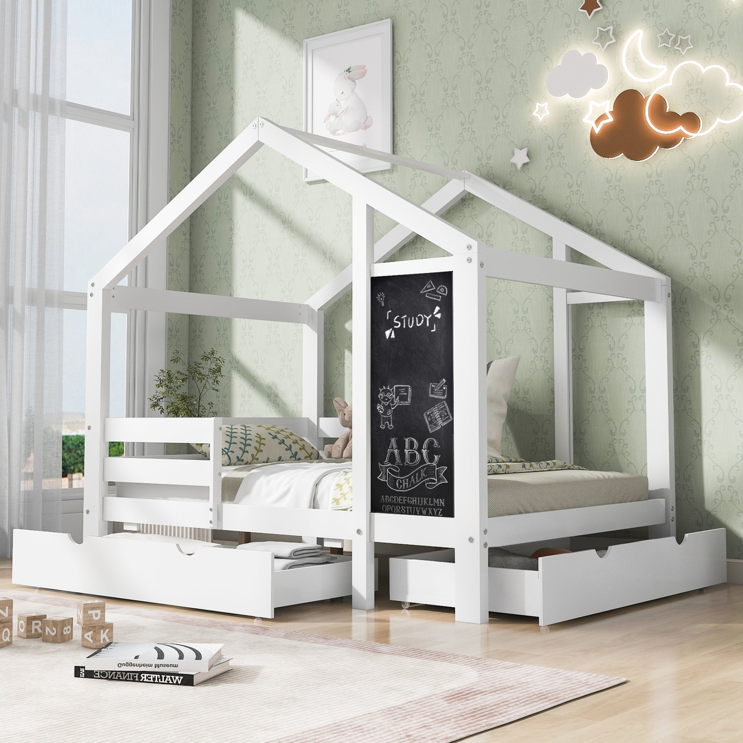 Full House Bed with Blackboard and Drawers Two assembly options White