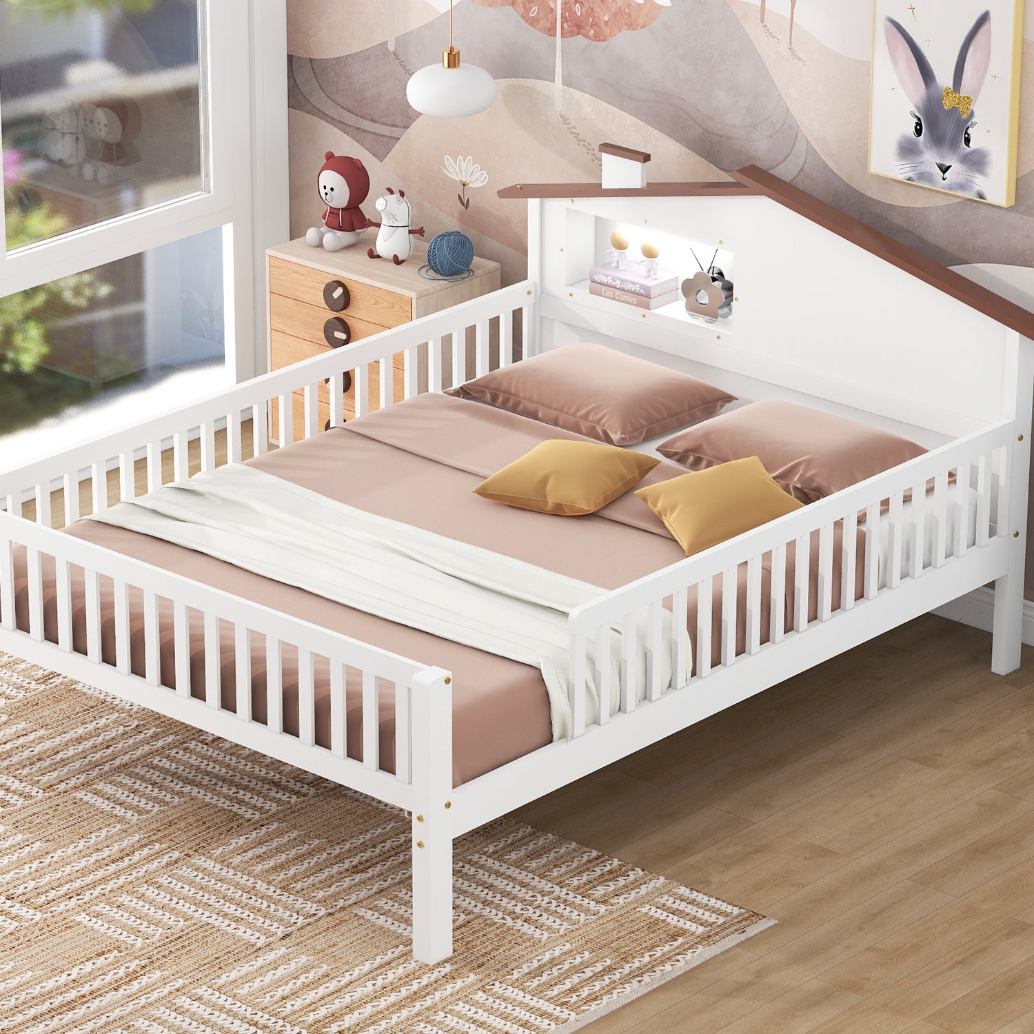 Full Size Wood Platform Bed with House-shaped Headboard, LED and Built-in Storage, White - White + Wood + Bedroom + Full is backordered and will ship as soon as it is back in stock.