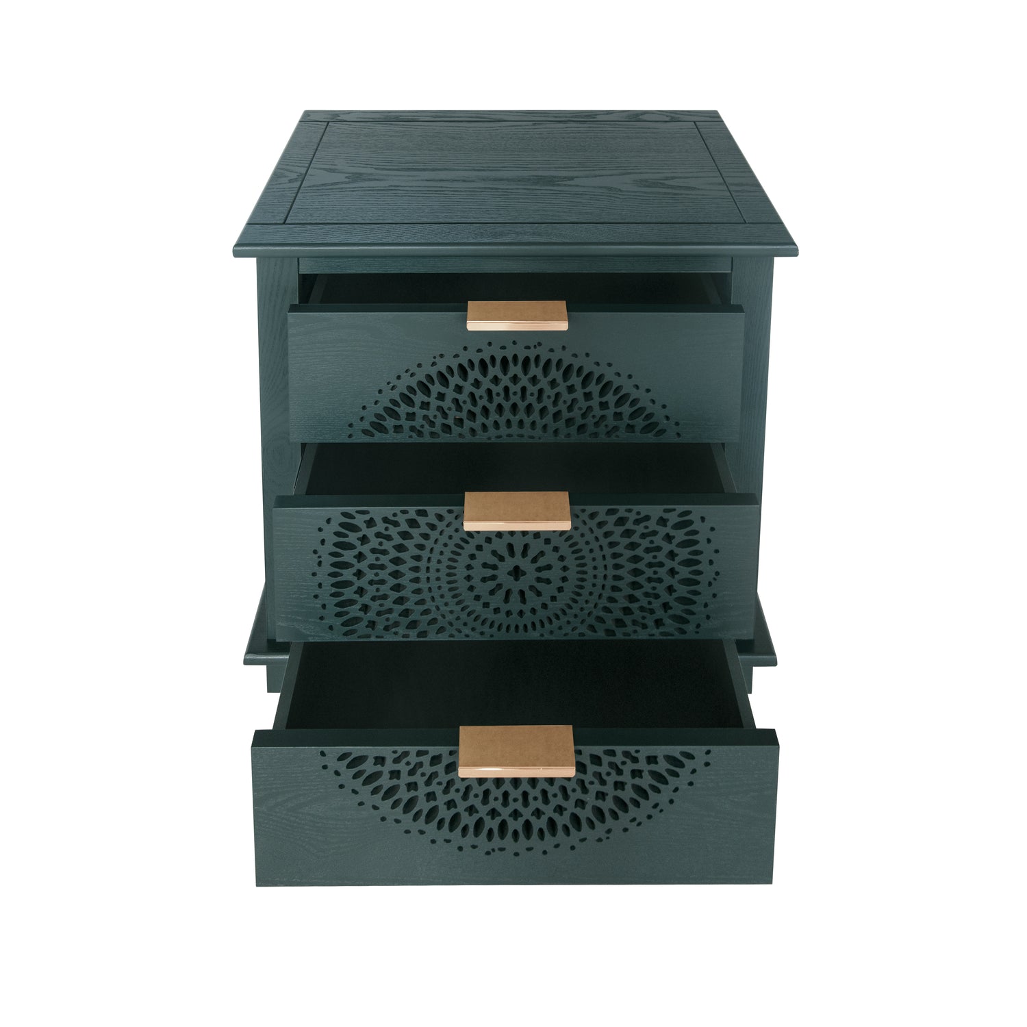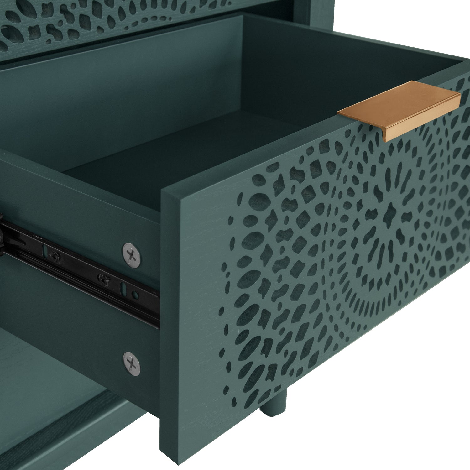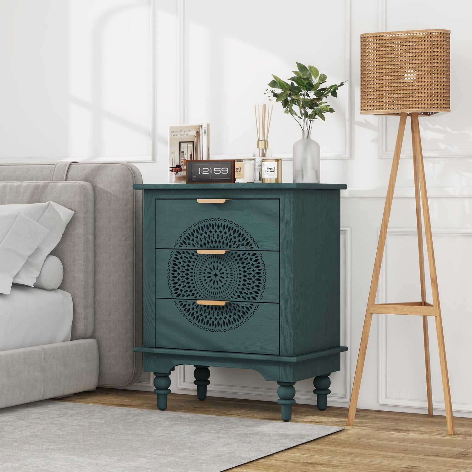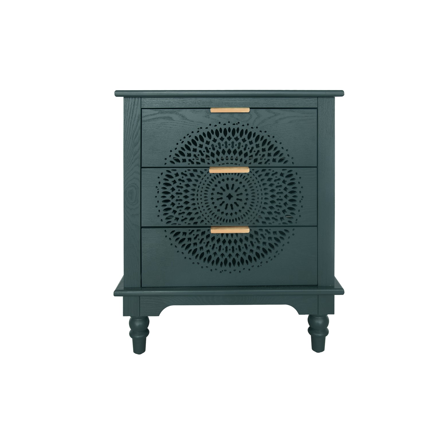 Hollow-Carved 3 Drawer Dresser Storage Chest with Metal Handles For Living Room Bedroom - Blackish Green is backordered and will ship as soon as it is back in stock.