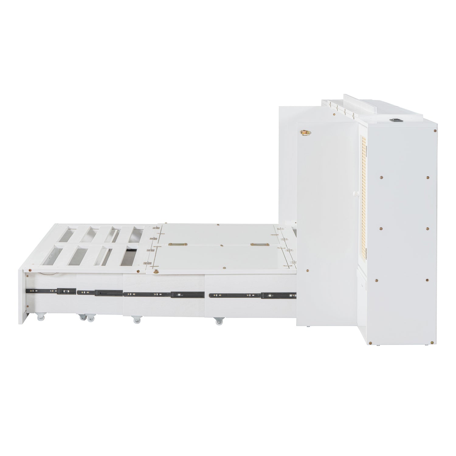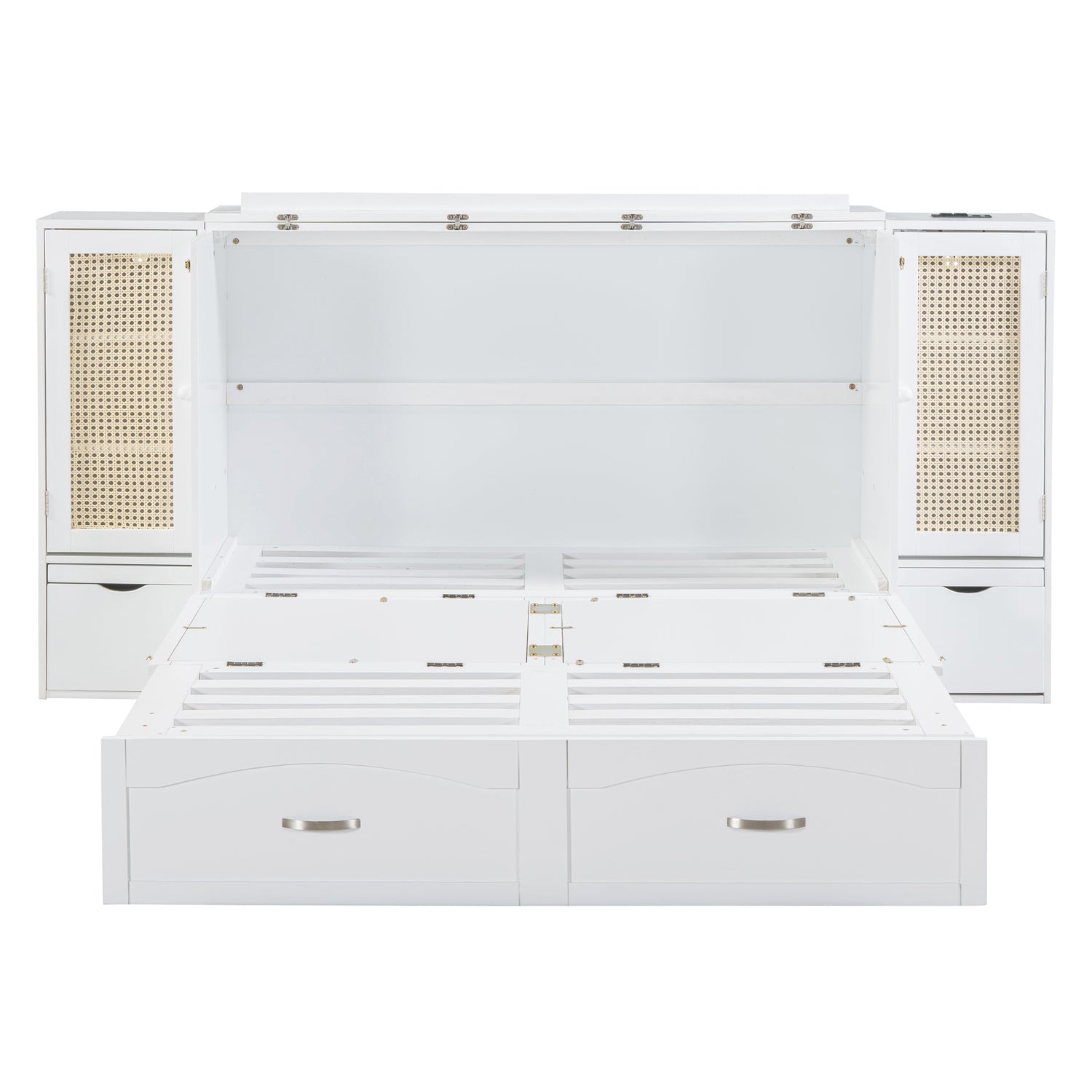 Large Murphy bed wall mounted bed with drawers, 2 storage cabinets, 1 set of sockets and USB ports, white