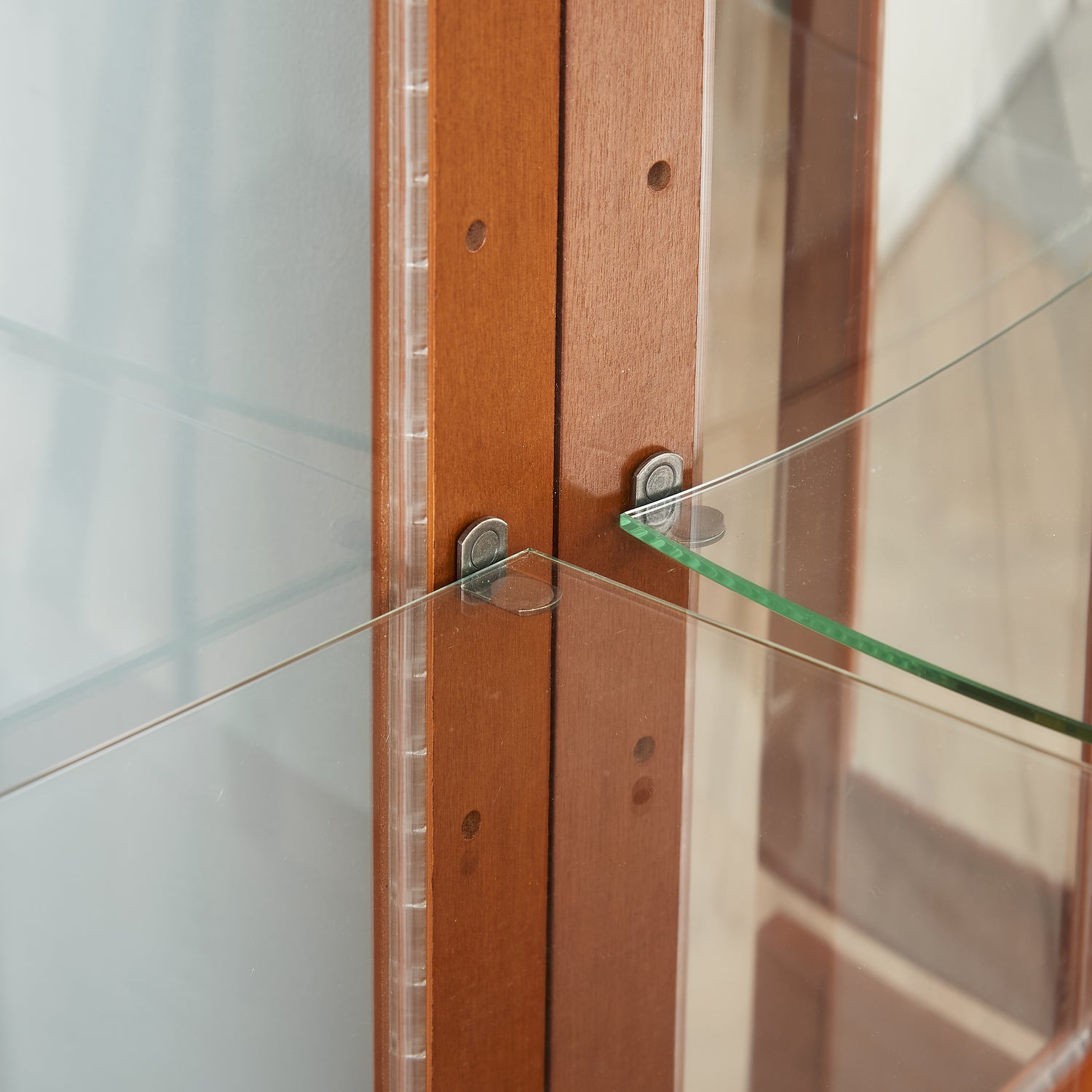 Adjustable shelving With a total of 6 shelves, 4 tempered glass shelves can be adjusted by moving the shelf peg into the peg hole height that's the right fit for collectables large and small. Each shelf has a 15 lb. weight capacity. Color:Walnut Material:Solid and composite wood Mounting Type:Floor Mount Style:Classic Door Style:Mirrored Number of Doors:4 Shape:Rectangular Number of Shelves:6 Product Care Instructions:Wipe clean with a dry cloth, Do not use strong liquid cleaners. Load Capacity:120 Pounds