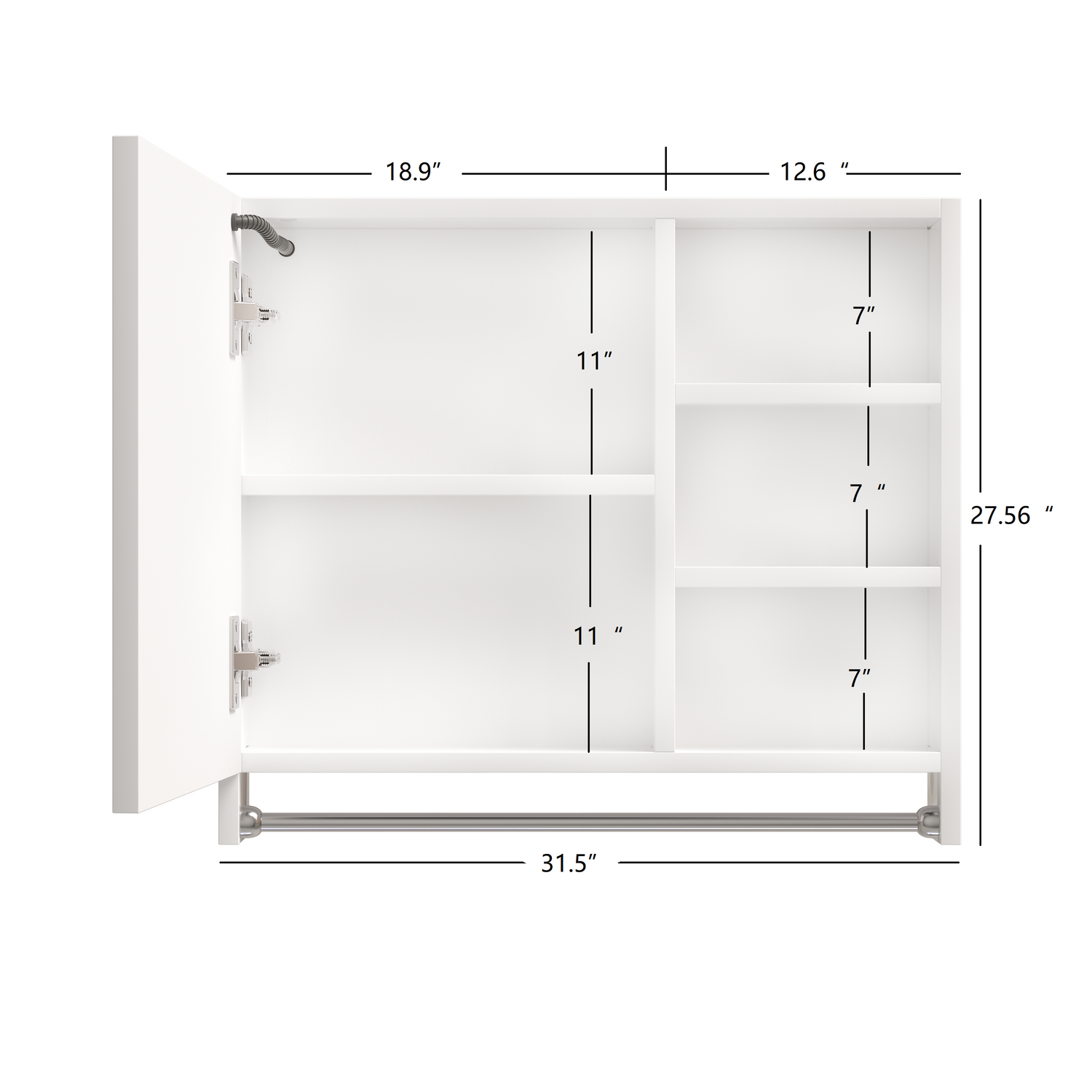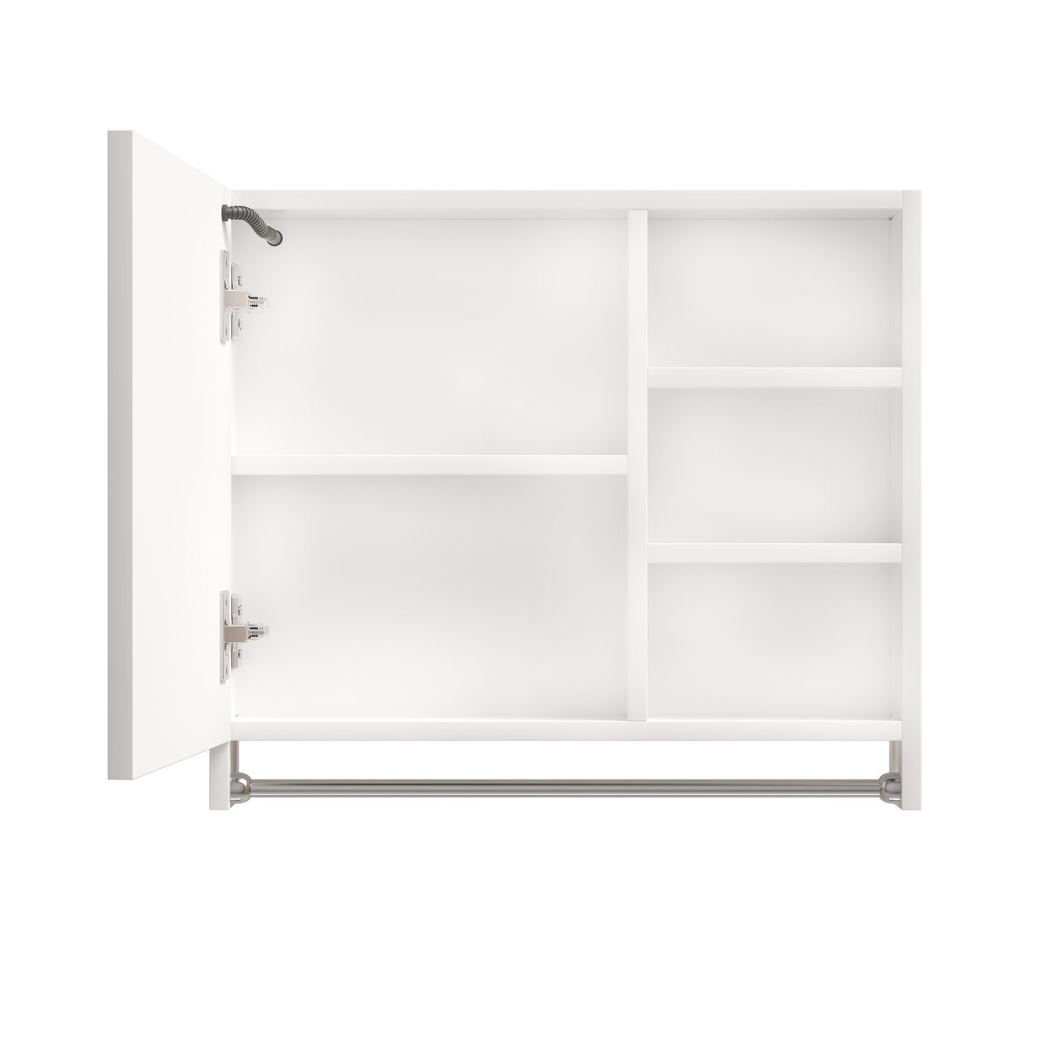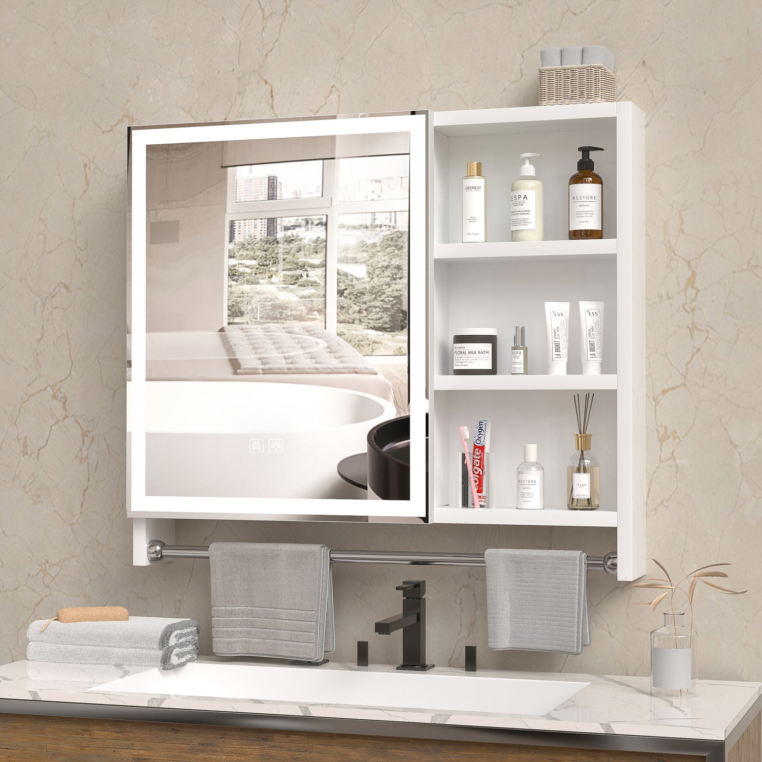 Behind the mirror of this medicine cabinet is a two-layer hidden storage compartment, and on the right is a three-layer external storage compartment, which can meet your diverse storage needs. Underneath the mirror is a stainless steel towel rail, so you can easily use your towels while washing
