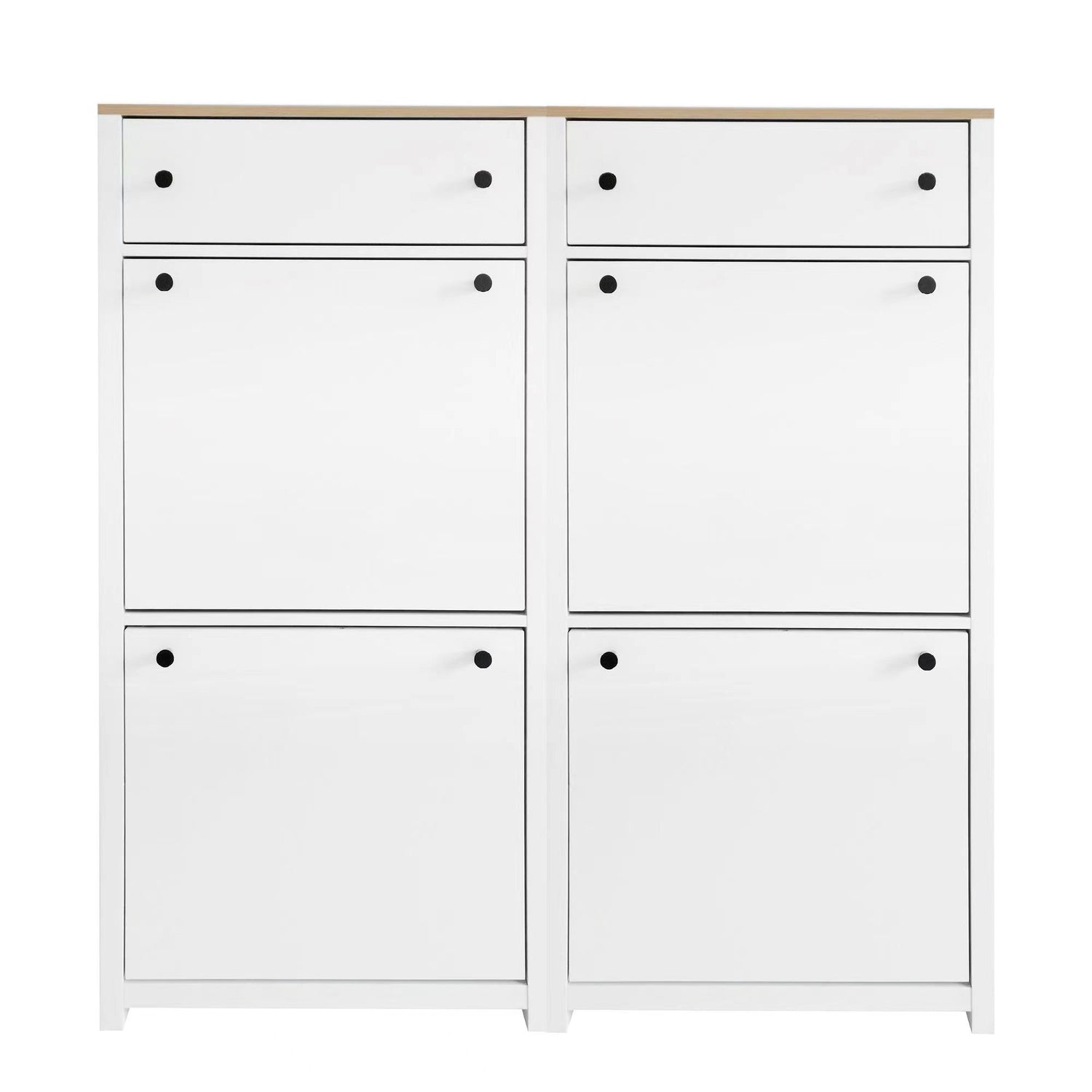 The 4 flip drawers with adjustable panels are practical for storing up to 24 pairs of shoes. Additionally, it features 2 convenient drawers that offer space for accessories such as shoe polish or spare laces. Moreover, the wood grain top serves as an excellent platform for decorations.