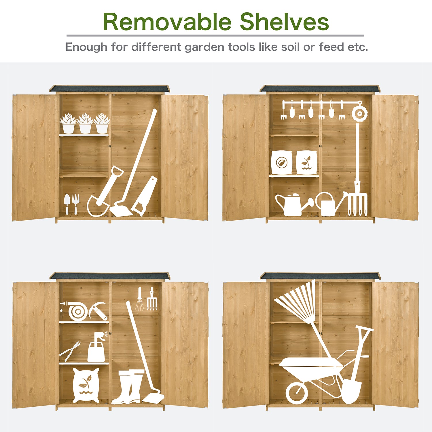 • [Spacious Storage Room] With 3-tier shelves, 2 of which are removable, and 1 large space inside, the tool organizer is deal for storing different tools and accessories such as watering can, spades, pots even some long tools etc. Each shelf of this tool storage cabinet can hold 33 lbs which is suitable for many kinds of outdoor equipment.