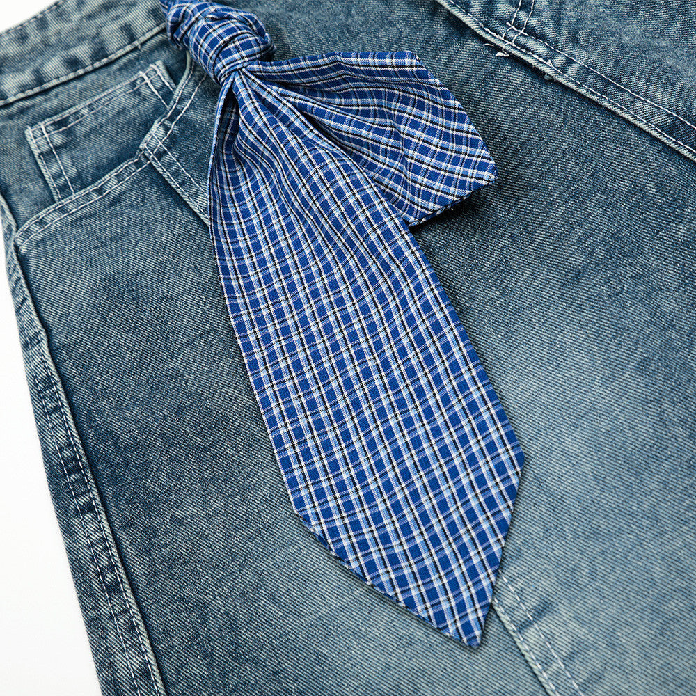 Punk Washed Distressed Denim Shorts Men's Summer Plaid Belted Contrast Pocket Loose Wide-Leg Three-Quarter Pants - V.I.P Digital Presence