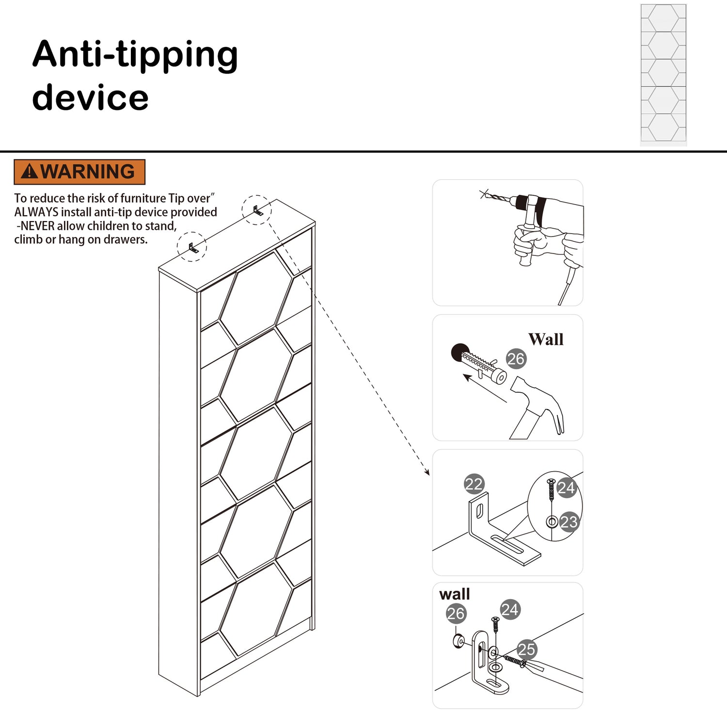 Anti-tipping Devices:Solid construction shoe cabinet: Crafted from sturdy MDF, this shoe organizer is as solid as they come. And with anti-tip kits for added safety and adjustable feet for uneven floors, it's a piece you can rely on, even with little loved ones around.