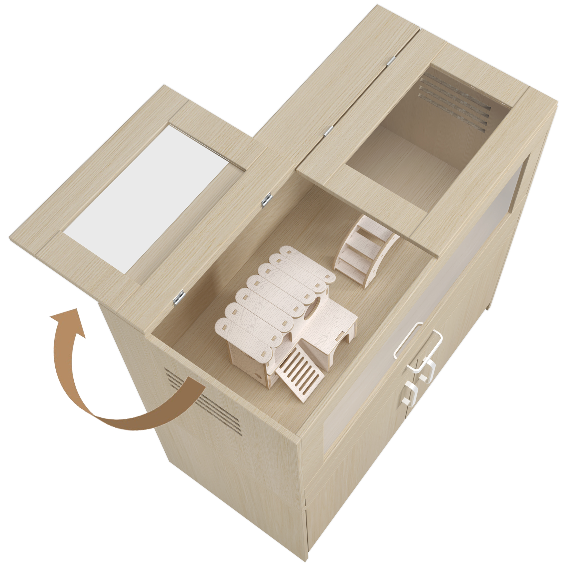The openable roof not only simplifies the cleaning process, but can be fed directly without disturbing the hamster's habitat too much. And the keepers can get up close and personal with the hamsters through the open roof.