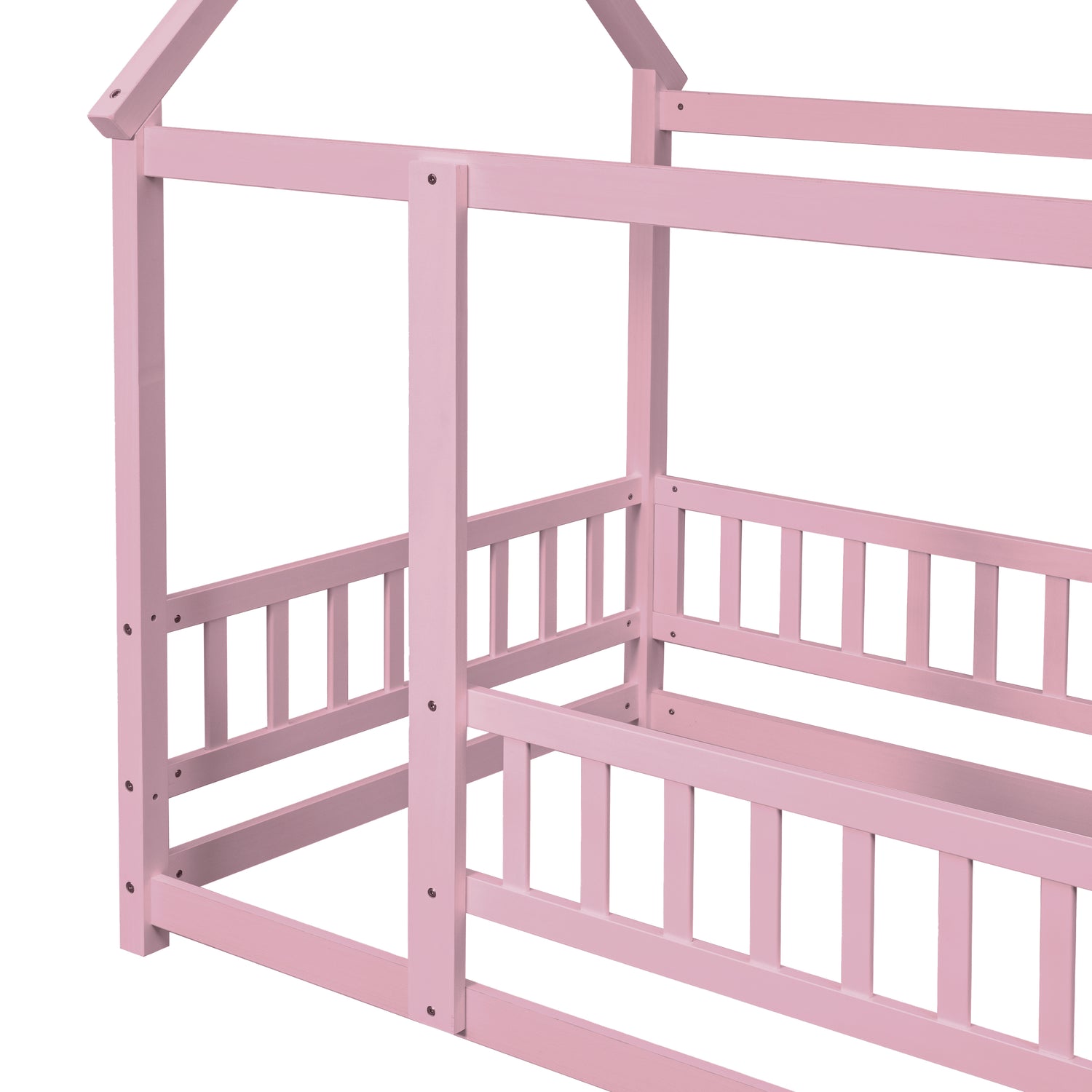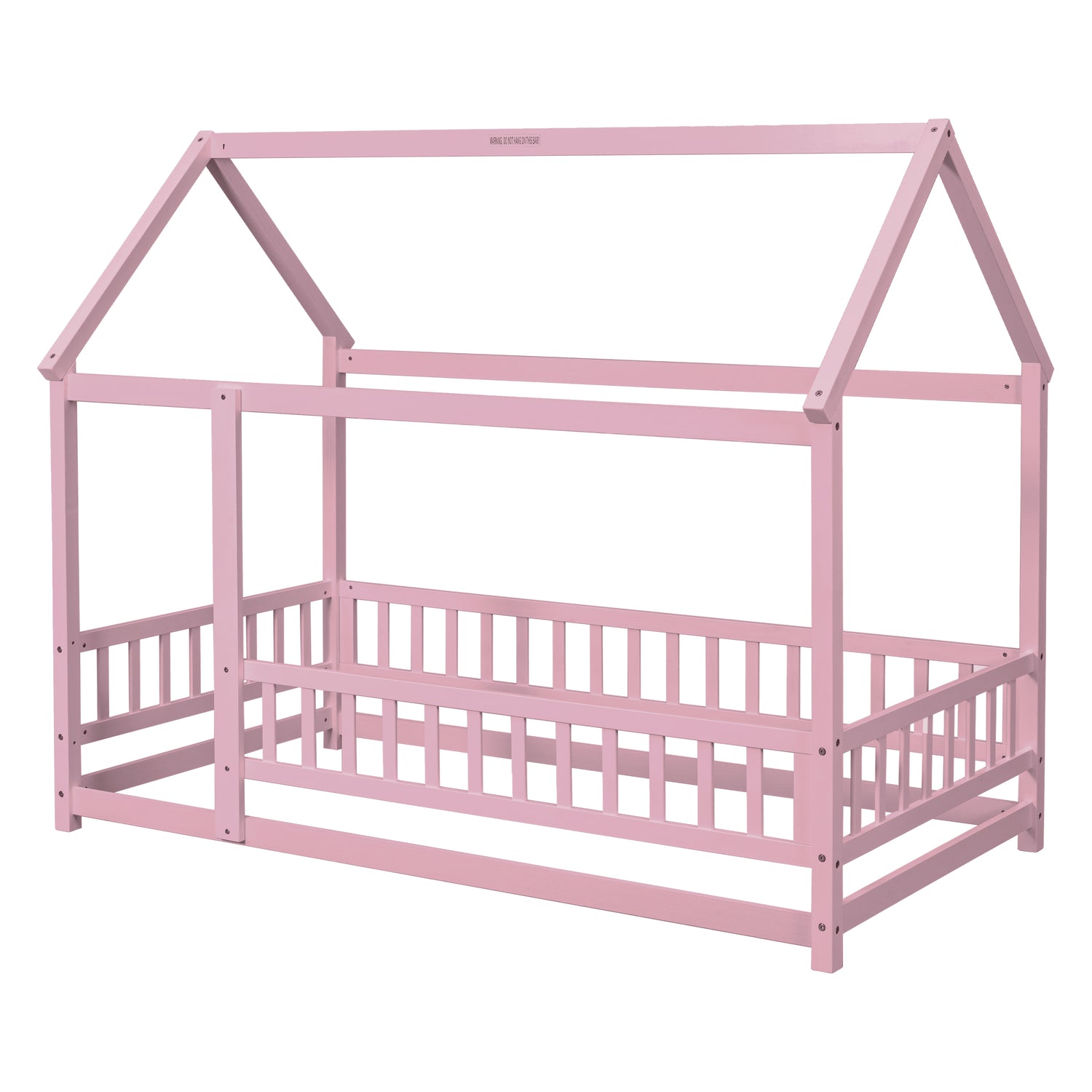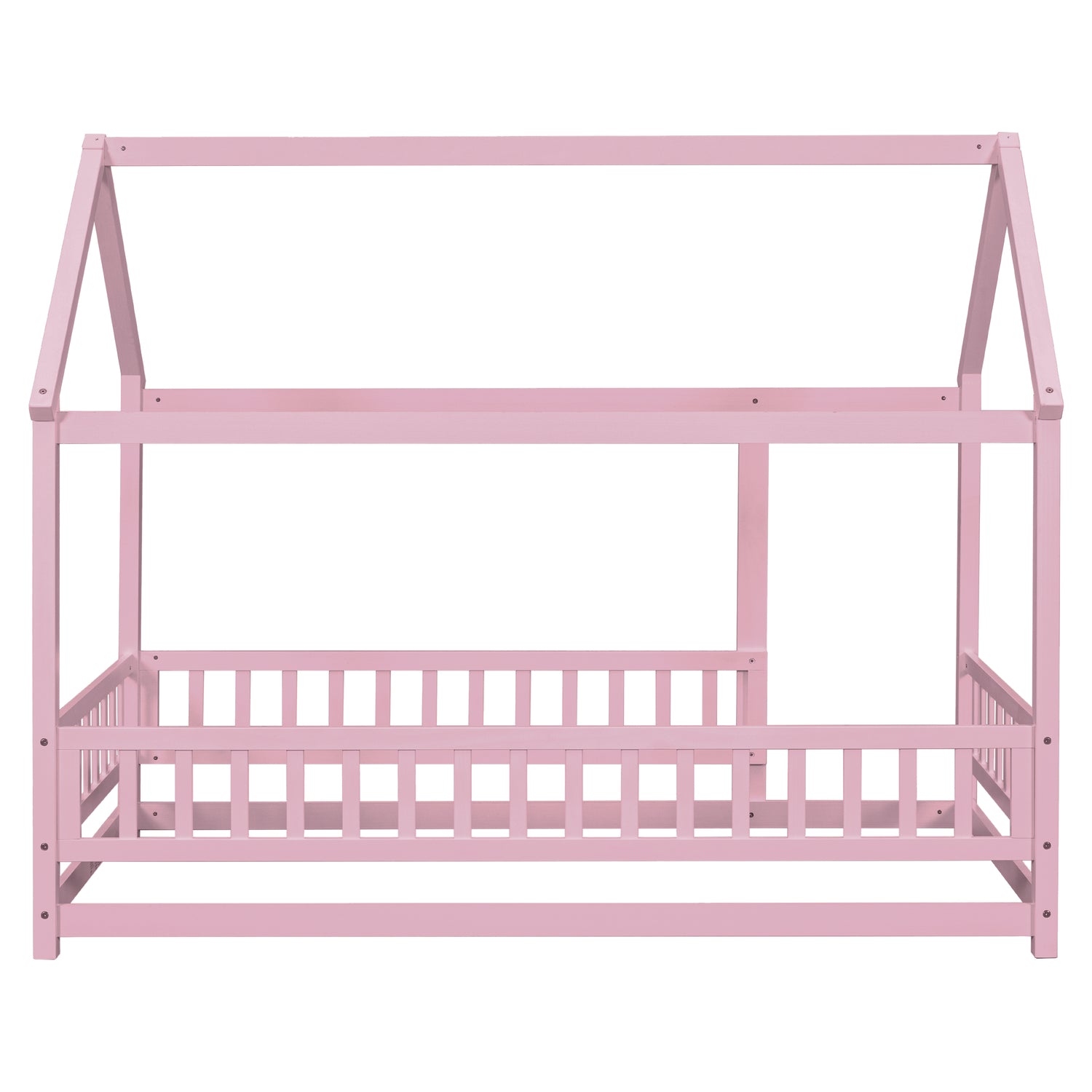 Twin Size Floor Wooden Bed with House Roof Frame, Fence Guardrails,Pink