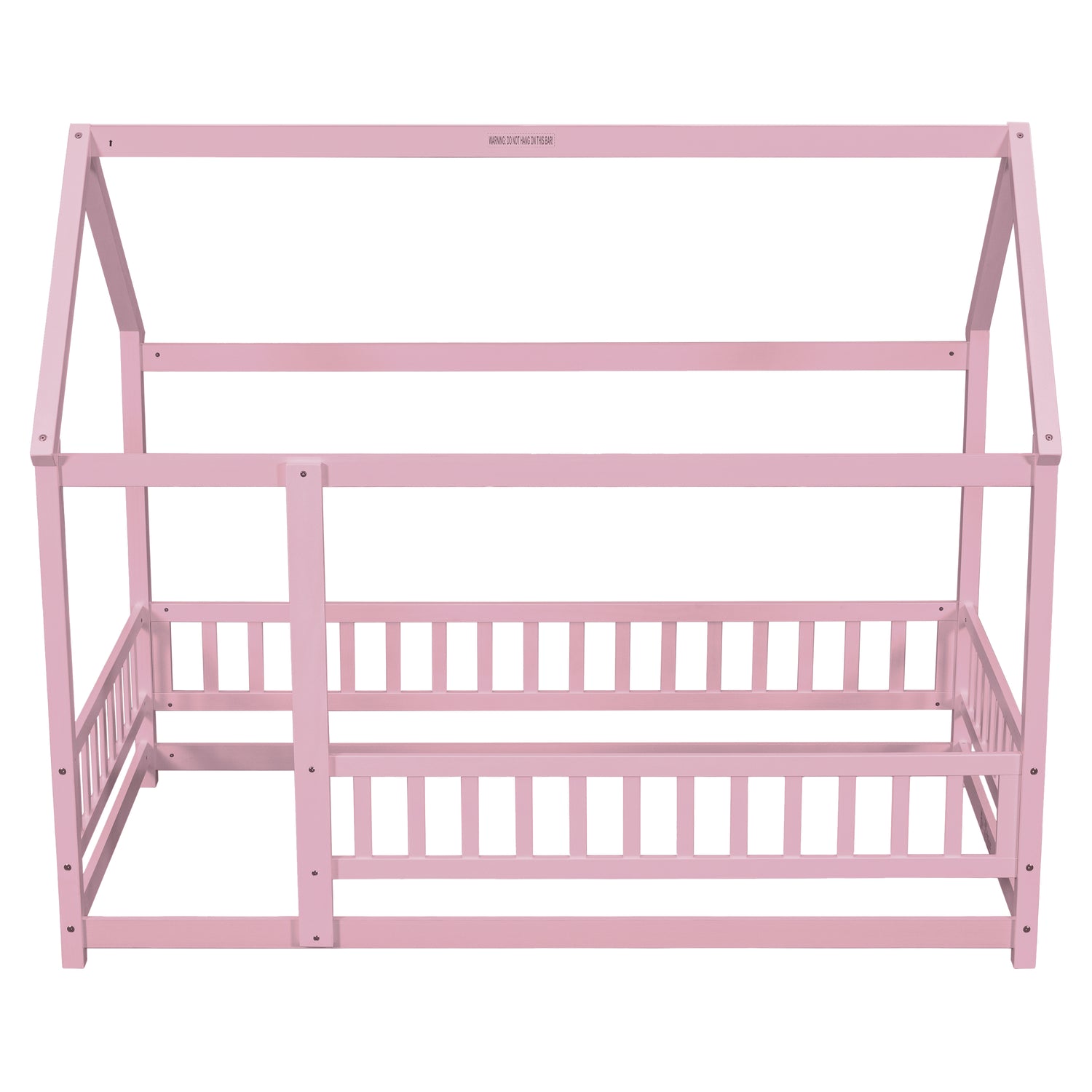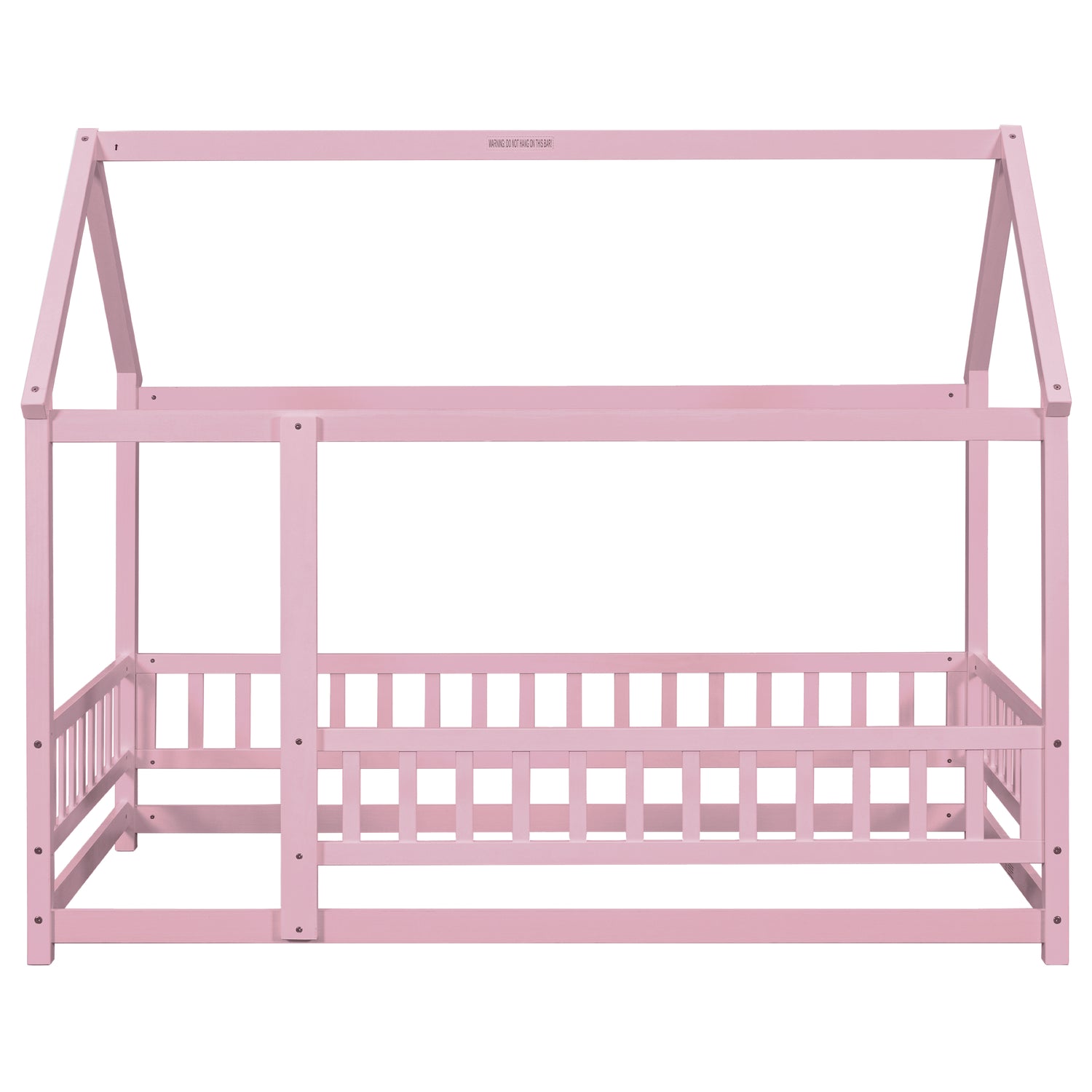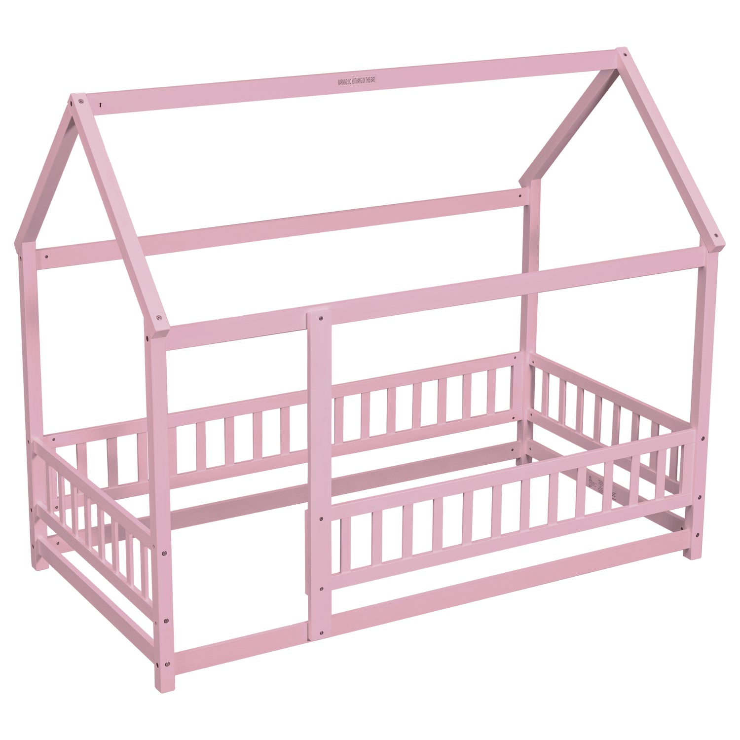 Twin Size Floor Wooden Bed with House Roof Frame, Fence Guardrails,Pink
