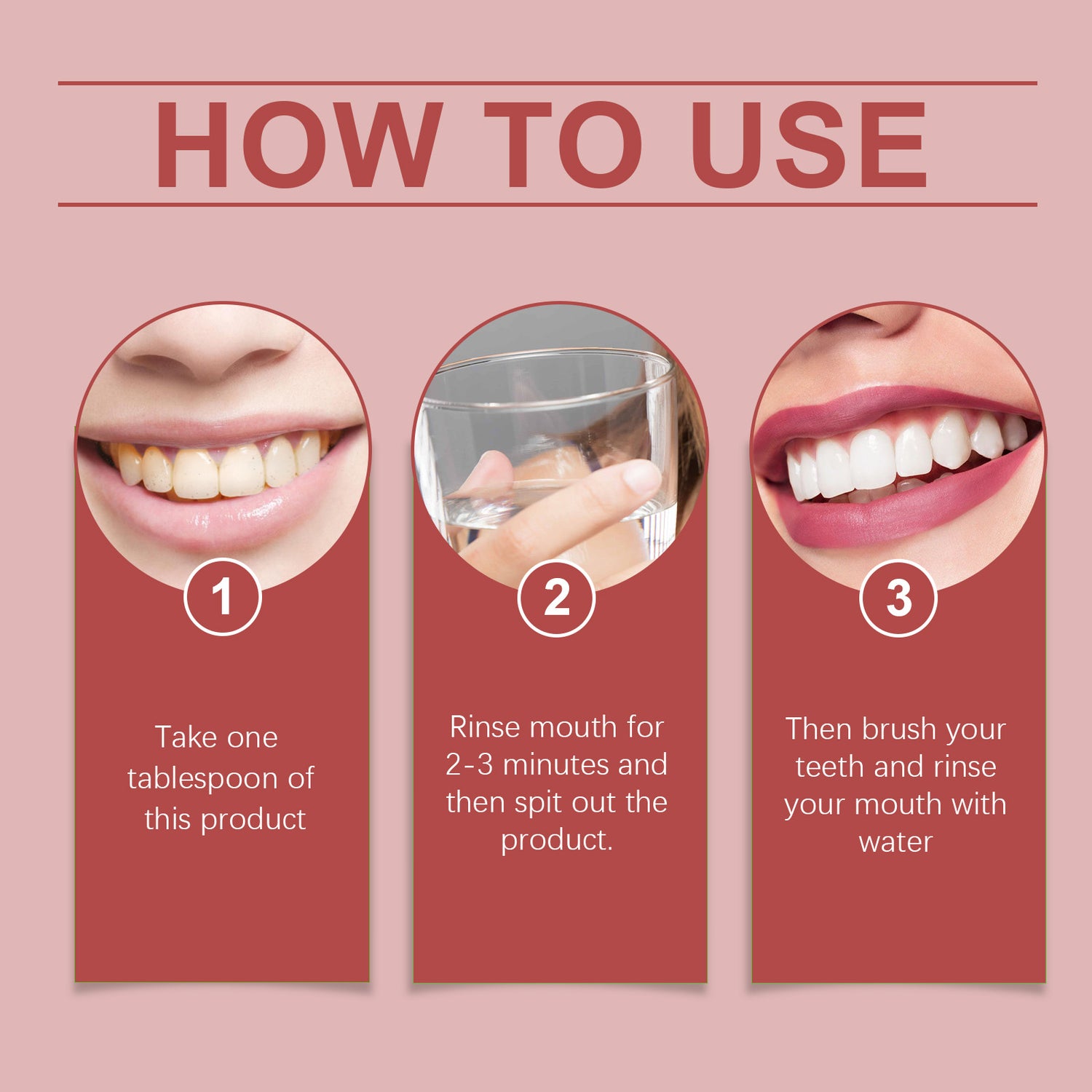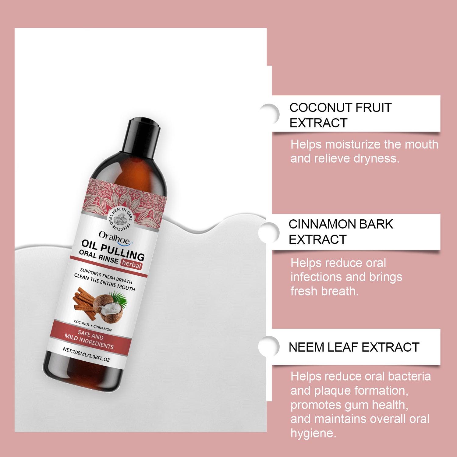 Our fresh breath mouthwash contains neem leaf extract and Nightshade extract. It can deeply clean the mouth and restore oral hygiene. Its use is simple: take a tablespoon of this product, rinse your mouth for 2-3 minutes, then spit it out, then brush your teeth and rinse your mouth with water. It can also effectively remove bad breath and keep your breath fresh for a long time.