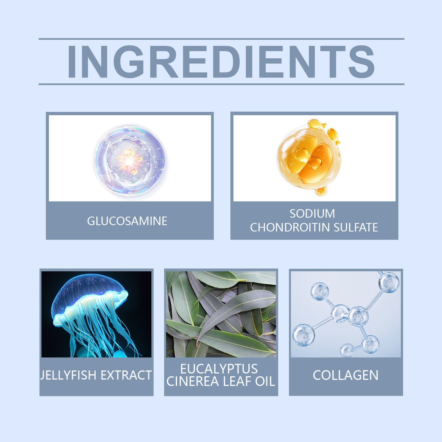 Our joint care cream contains eucalyptus leaf oil and jellyfish extract. It can solve the problems of joint and bone injuries and deformities and restore your joints and bones to a healthy state. Its use method is very simple: clean the skin, keep dry, take an appropriate amount of this product, evenly apply to the affected area, gently massage, so that it is completely absorbed. It can also enhance joint toughness and support flexible movement.