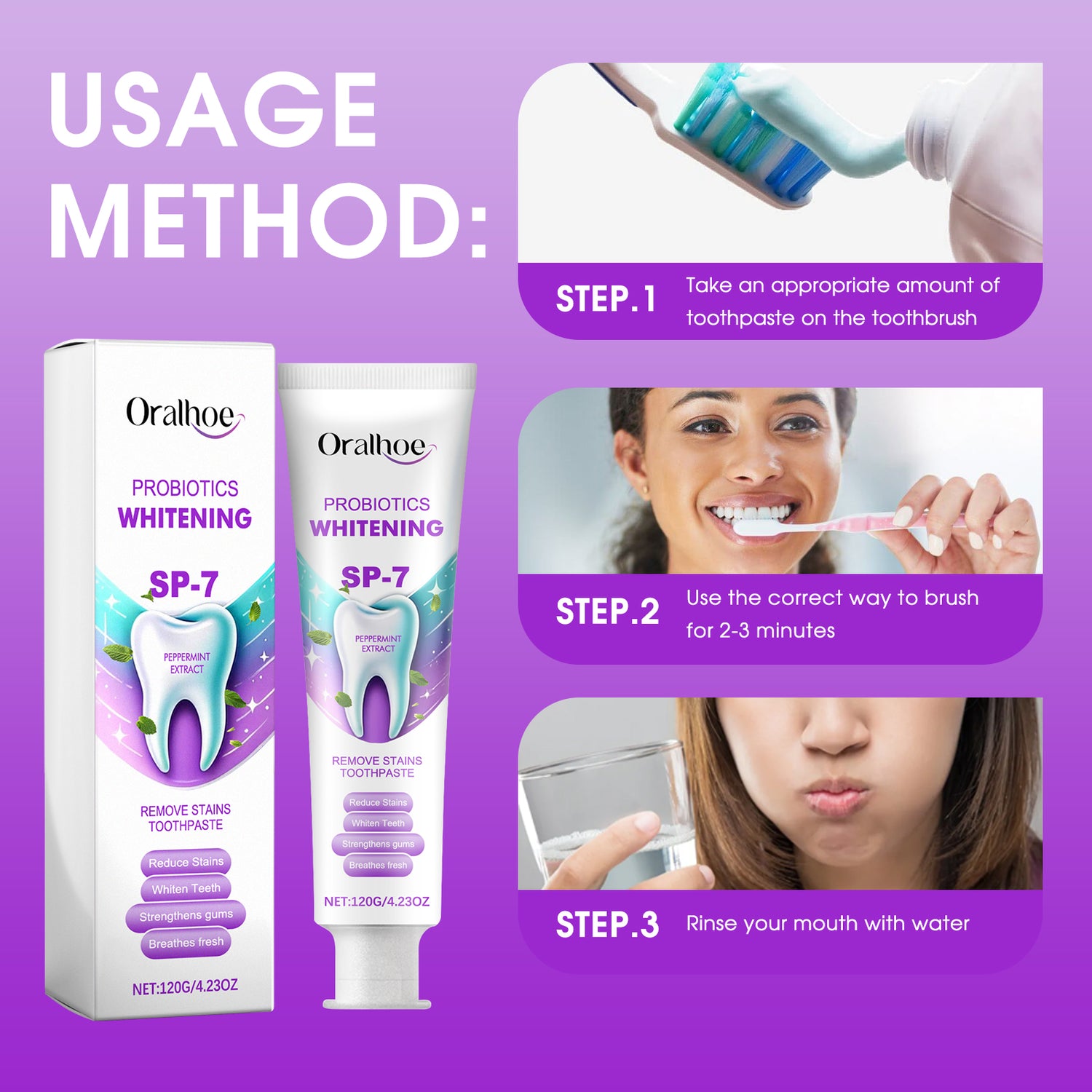 Our Probiotics Whitening Remove Stains Toothpaste contains Xylitol, Cocos Nucifera(Coconut) Oil, Mentha Piperita(Peppermint)Extract. It is an effective and quick removal of years of stains caused by coffee, tea and alcohol, makes your teeth noticeably whiter, prevents bad breath, and also helps to freshen your breath and give you a more confident smile. Its use is very simple: take a proper amount of toothpaste on the toothbrush, brush with the correct method for 2-3 minutes, and finally rinse your mouth with water. It can dissolve and remove stains on the surface of teeth, prevent new stains from setting, strengthen tooth enamel, prevent tooth decay, and protect the health of teeth and gums.
