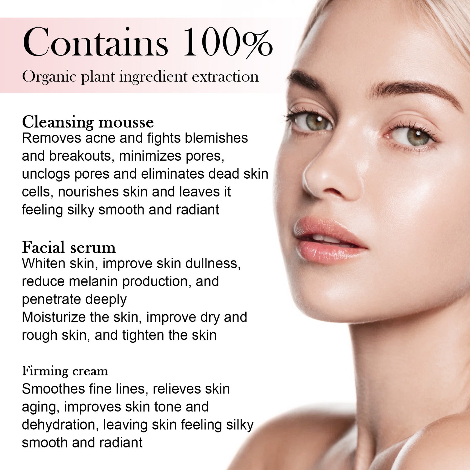 Our 5-in-1 facial moisturizing set contains hyaluronic acid, niacinamide, and vitamin c. It can help manage and relieve itching, burns, peeling and pain caused by seborrheic dermatitis, folliculitis and psoriasis. It helps to eliminate the recurrence of seborrheic dermatitis and psoriasis and restore natural skin. Its use method is very simple: cleansing mousse: use once in the morning and evening, evenly apply, massage with water after massage, serum: 1-2 times a day, massage until absorbed after use, cream: use in the morning and evening, massage until absorbed. And skin care.